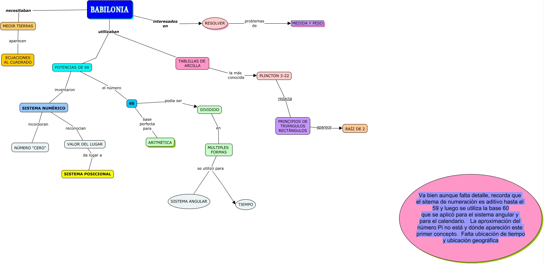 Este Cmap, tiene información relacionada con: BABILONIA, POTENCIAS DE 60 el número 60, MEDIR TIERRAS aparecen ECUACIONES AL CUADRADO, PLINCTON 3-22 redacta PRINCIPIOS DE TRIÁNGULOS RECTÁNGULOS, SISTEMA NUMÉRICO reconocian VALOR DEL LUGAR, 60 podia ser DIVIDIDO, PRINCIPIOS DE TRIÁNGULOS RECTÁNGULOS aparece RAÍZ DE 2, MULTIPLES FORMAS se utilizó para SISTEMA ANGULAR, TABLILLAS DE ARCILLA la más conocida PLINCTON 3-22, SISTEMA NUMÉRICO incorporan NÚMERO "CERO", BABILONIA utilizaban POTENCIAS DE 60, VALOR DEL LUGAR da lugar a SISTEMA POSICIONAL, MULTIPLES FORMAS se utilizó para TIEMPO, BABILONIA utilizaban TABLILLAS DE ARCILLA, RESOLVER problemas de MEDIDA Y PESO, BABILONIA necesitaban MEDIR TIERRAS, BABILONIA interesados en RESOLVER, 60 base perfecta para ARITMÉTICA, DIVIDIDO en MULTIPLES FORMAS, POTENCIAS DE 60 inventaron SISTEMA NUMÉRICO