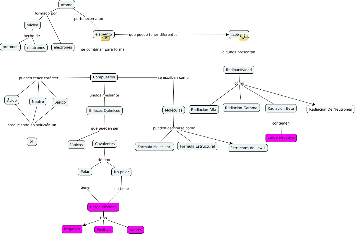 Este Cmap, tiene información relacionada con: Nociones de Química Trabajo colaborativo COLPUE, Radioactividad como Radiación Gamma, Compuestos pueden tener carácter Ácido, Radiación Beta contienen carga negativa, Carga eléctrica tipo Neutra, Átomo pertenecen a un elemento, Covalentes de tipo No polar, Compuestos pueden tener carácter Básico, Carga eléctrica tipo Negariva, Ácido produciendo en solución un pH, Moléculas pueden escribirse como Fórmula Estructural, Radioactividad como Radiación Beta, Radioactividad como Radiación Alfa, Básico produciendo en solución un pH, Moléculas pueden escribirse como Estructura de Lewis, núcleo hecho de protones, Moléculas pueden escribirse como Fórmula Molecular, Covalentes de tipo Polar, elemento que puede tener diferentes Isótopos, Átomo formado por núcleo, Compuestos pueden tener carácter Neutro