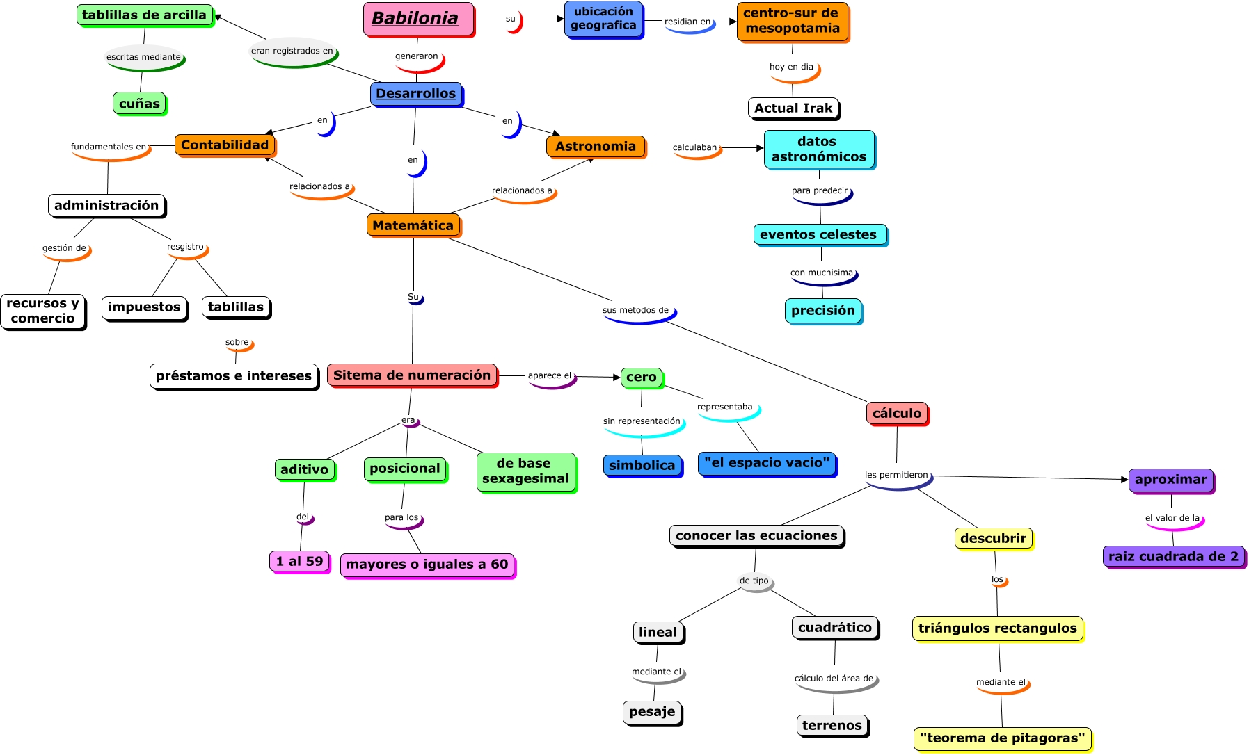 Este Cmap, tiene información relacionada con: Civilización Babilonica, triángulos rectangulos mediante el "teorema de pitagoras", tablillas sobre préstamos e intereses, ubicación geografica residian en centro-sur de mesopotamia, Desarrollos en Astronomia, Sitema de numeración aparece el cero, aditivo del 1 al 59, descubrir los triángulos rectangulos, Matemática sus metodos de cálculo, aproximar el valor de la raiz cuadrada de 2, cálculo les permitieron conocer las ecuaciones, cero sin representación simbolica, posicional para los mayores o iguales a 60, centro-sur de mesopotamia hoy en dia Actual Irak, datos astronómicos para predecir eventos celestes, Desarrollos en Contabilidad, lineal mediante el pesaje, administración resgistro impuestos, conocer las ecuaciones de tipo cuadrático, Matemática Su Sitema de numeración, Sitema de numeración era posicional