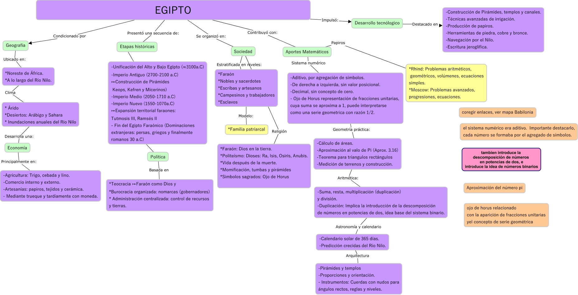 Este Cmap, tiene información relacionada con: Egipto, -Unificación del Alto y Bajo Egipto (≈3100a.C) -Imperio Antiguo (2700-2100 a.C) ↦Construcción de Pirámides Keops, Kefren y Micerinos) -Imperio Medio (2050-1710 a.C) -Imperio Nuevo (1550-1070a.C) ↦Expansión territorial faraones: Tutmosis III, Ramsés II - Fin del Egipto Faraónico (Dominaciones extranjeras: persas, griegos y finalmente romanos 30 a.C) ???? Política, Desarrollo tecnólogico Destacado en -Construcción de Pirámides, templos y canales. -Técnicas avanzadas de irrigación. -Producción de papiros. -Herramientas de piedra, cobre y bronce. -Navegación por el Nilo. -Escritura jeroglifica., -Cálculo de áreas. -Aproximación al valo de Pi (Aprox. 3.16) -Teorema para triangulos rectángulos -Medición de terrenos y construcción. Aritmética: -Suma, resta, multiplicación (duplicación) y división. -Duplicación: Implica la introducción de la descomposición de números en potencias de dos, idea base del sistema binario., -Aditivo, por agregación de símbolos. -De derecha a izquierda, sin valor posicional. -Decimal, sin concepto de cero. - Ojo de Horus representación de fracciones unitarias, cuya suma se aproxima a 1, puede interpretarse como una serie geometrica con razón 1/2. Geometría práctica: -Cálculo de áreas. -Aproximación al valo de Pi (Aprox. 3.16) -Teorema para triangulos rectángulos -Medición de terrenos y construcción., Geografía Ubicado en: *Noreste de África. *A lo largo del Río Nilo., EGIPTO Impulsó: Desarrollo tecnólogico, EGIPTO Presentó una secuencia de: Etapas históricas, * Árido *Desiertos: Arábigo y Sahara * Inundaciones anuales del Río Nilo Desarrolla una: Economía, *Faraón *Nobles y sacerdotes *Escribas y artesanos *Campesinos y trabajadores *Esclavos Modelo: *Familia patriarcal, -Calendario solar de 365 días. -Predicción crecidas del Río Nilo. Arquitectura -Pirámides y templos -Proporciones y orientación. - Instrumentos: Cuerdas con nudos para ángulos rectos, reglas y niveles., EGIPTO Se organizó en: Sociedad, EGIPTO Contribuyó con: Aportes Matemáticos, Aportes Matemáticos Sistema numérico -Aditivo, por agregación de símbolos. -De derecha a izquierda, sin valor posicional. -Decimal, sin concepto de cero. - Ojo de Horus representación de fracciones unitarias, cuya suma se aproxima a 1, puede interpretarse como una serie geometrica con razón 1/2., -Suma, resta, multiplicación (duplicación) y división. -Duplicación: Implica la introducción de la descomposición de números en potencias de dos, idea base del sistema binario. Astronomía y calendario -Calendario solar de 365 días. -Predicción crecidas del Río Nilo., Sociedad Religión *Faraón: Dios en la tierra. *Politeísmo: Dioses: Ra, Isis, Osiris, Anubis. *Vida después de la muerte. *Momificación, tumbas y pirámides *Simbolos sagrados: Ojo de Horus, Etapas históricas ???? -Unificación del Alto y Bajo Egipto (≈3100a.C) -Imperio Antiguo (2700-2100 a.C) ↦Construcción de Pirámides Keops, Kefren y Micerinos) -Imperio Medio (2050-1710 a.C) -Imperio Nuevo (1550-1070a.C) ↦Expansión territorial faraones: Tutmosis III, Ramsés II - Fin del Egipto Faraónico (Dominaciones extranjeras: persas, griegos y finalmente romanos 30 a.C), EGIPTO Condicionado por Geografía, Sociedad Estratificada en niveles: *Faraón *Nobles y sacerdotes *Escribas y artesanos *Campesinos y trabajadores *Esclavos, *Noreste de África. *A lo largo del Río Nilo. Clima * Árido *Desiertos: Arábigo y Sahara * Inundaciones anuales del Río Nilo, Aportes Matemáticos Papiros *Rhind: Problemas aritméticos, geométricos, volúmenes, ecuaciones simples. *Moscow: Problemas avanzados, progresiones, ecuaciones.