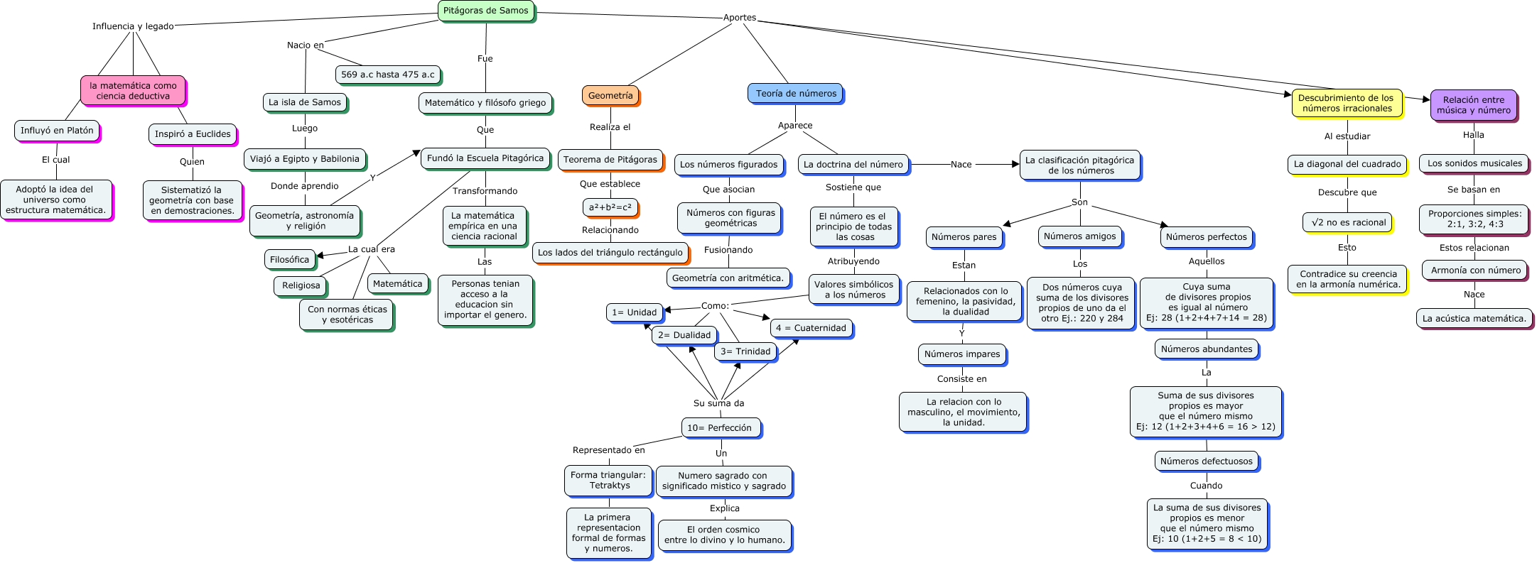 Este Cmap, tiene información relacionada con: Pitágoras de Samos, Viajó a Egipto y Babilonia Donde aprendio Geometría, astronomía y religión, Cuya suma de divisores propios es igual al número Ej: 28 (1+2+4+7+14 = 28) ???? Números abundantes, Teoría de números Aparece La doctrina del número, La doctrina del número Sostiene que El número es el principio de todas las cosas, Pitágoras de Samos Aportes Descubrimiento de los números irracionales, Relacionados con lo femenino, la pasividad, la dualidad Y Números impares, Valores simbólicos a los números Como: 4 = Cuaternidad, Números con figuras geométricas Fusionando Geometría con aritmética., Forma triangular: Tetraktys Es La primera representacion formal de formas y numeros., Fundó la Escuela Pitagórica La cual era Con normas éticas y esotéricas, Números perfectos Aquellos Cuya suma de divisores propios es igual al número Ej: 28 (1+2+4+7+14 = 28), Números impares Consiste en La relacion con lo masculino, el movimiento, la unidad., La doctrina del número Nace La clasificación pitagórica de los números, 10= Perfección Su suma da 3= Trinidad, La clasificación pitagórica de los números Son Números perfectos, Pitágoras de Samos Fue Matemático y filósofo griego, Descubrimiento de los números irracionales Al estudiar La diagonal del cuadrado, Matemático y filósofo griego Que Fundó la Escuela Pitagórica, La clasificación pitagórica de los números Son Números pares, Números amigos Los Dos números cuya suma de los divisores propios de uno da el otro Ej.: 220 y 284