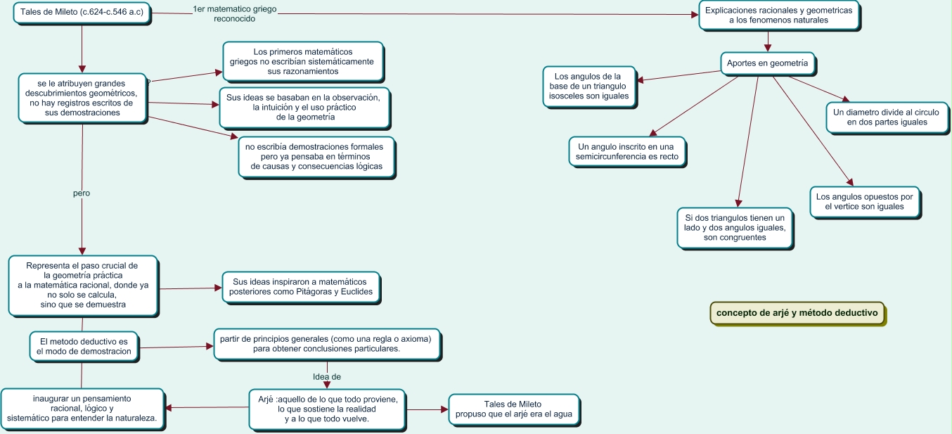 Este Cmap, tiene información relacionada con: THALES DE MILETO, El metodo deductivo es el modo de demostracion ???? ????, Aportes en geometría ???? Los angulos de la base de un triangulo isosceles son iguales, Aportes en geometría ???? Un diametro divide al circulo en dos partes iguales, Explicaciones racionales y geometricas a los fenomenos naturales ???? Aportes en geometría, Representa el paso crucial de la geometría práctica a la matemática racional, donde ya no solo se calcula, sino que se demuestra ???? Sus ideas inspiraron a matemáticos posteriores como Pitágoras y Euclides, se le atribuyen grandes descubrimientos geométricos, no hay registros escritos de sus demostraciones ???? Sus ideas se basaban en la observación, la intuición y el uso práctico de la geometría, se le atribuyen grandes descubrimientos geométricos, no hay registros escritos de sus demostraciones ???? no escribía demostraciones formales pero ya pensaba en términos de causas y consecuencias lógicas, Aportes en geometría ???? Un angulo inscrito en una semicircunferencia es recto, partir de principios generales (como una regla o axioma) para obtener conclusiones particulares. Idea de Arjé :aquello de lo que todo proviene, lo que sostiene la realidad y a lo que todo vuelve., Tales de Mileto (c.624-c.546 a.c) 1er matematico griego reconocido Explicaciones racionales y geometricas a los fenomenos naturales, Arjé :aquello de lo que todo proviene, lo que sostiene la realidad y a lo que todo vuelve. ???? Tales de Mileto propuso que el arjé era el agua, Arjé :aquello de lo que todo proviene, lo que sostiene la realidad y a lo que todo vuelve. ???? inaugurar un pensamiento racional, lógico y sistemático para entender la naturaleza., Aportes en geometría ???? Si dos triangulos tienen un lado y dos angulos iguales, son congruentes, se le atribuyen grandes descubrimientos geométricos, no hay registros escritos de sus demostraciones ???? Los primeros matemáticos griegos no escribían sistemáticamente sus razonamientos, se le atribuyen grandes descubrimientos geométricos, no hay registros escritos de sus demostraciones pero Representa el paso crucial de la geometría práctica a la matemática racional, donde ya no solo se calcula, sino que se demuestra, Representa el paso crucial de la geometría práctica a la matemática racional, donde ya no solo se calcula, sino que se demuestra El metodo deductivo es el modo de demostracion, El metodo deductivo es el modo de demostracion ???? partir de principios generales (como una regla o axioma) para obtener conclusiones particulares., Tales de Mileto (c.624-c.546 a.c) ???? se le atribuyen grandes descubrimientos geométricos, no hay registros escritos de sus demostraciones, Aportes en geometría ???? Los angulos opuestos por el vertice son iguales
