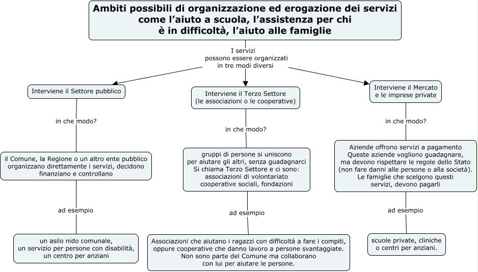 Questa Cmap, creata con IHMC CmapTools, contiene informazioni relative a: Prima domanda Dirigenza Ambiti servizi, Ambiti possibili di organizzazione ed erogazione dei servizi come l’aiuto a scuola, l’assistenza per chi è in difficoltà, l’aiuto alle famiglie I servizi possono essere organizzati in tre modi diversi Interviene il Settore pubblico, Interviene il Settore pubblico in che modo? il Comune, la Regione o un altro ente pubblico organizzano direttamente i servizi, decidono finanziano e controllano, Ambiti possibili di organizzazione ed erogazione dei servizi come l’aiuto a scuola, l’assistenza per chi è in difficoltà, l’aiuto alle famiglie I servizi possono essere organizzati in tre modi diversi Interviene il Terzo Settore (le associazioni o le cooperative), il Comune, la Regione o un altro ente pubblico organizzano direttamente i servizi, decidono finanziano e controllano ad esempio un asilo nido comunale, un servizio per persone con disabilità, un centro per anziani, Ambiti possibili di organizzazione ed erogazione dei servizi come l’aiuto a scuola, l’assistenza per chi è in difficoltà, l’aiuto alle famiglie I servizi possono essere organizzati in tre modi diversi Interviene il Mercato e le imprese private, Aziende offrono servizi a pagamento Queste aziende vogliono guadagnare, ma devono rispettare le regole dello Stato (non fare danni alle persone o alla società). Le famiglie che scelgono questi servizi, devono pagarli ad esempio scuole private, cliniche o centri per anziani., Interviene il Terzo Settore (le associazioni o le cooperative) in che modo? gruppi di persone si uniscono per aiutare gli altri, senza guadagnarci Si chiama Terzo Settore e ci sono: associazioni di volontariato cooperative sociali, fondazioni, gruppi di persone si uniscono per aiutare gli altri, senza guadagnarci Si chiama Terzo Settore e ci sono: associazioni di volontariato cooperative sociali, fondazioni ad esempio Associazioni che aiutano i ragazzi con difficoltà a fare i compiti, oppure cooperative che danno lavoro a persone svantaggiate. Non sono parte del Comune ma collaborano con lui per aiutare le persone., Interviene il Mercato e le imprese private in che modo? Aziende offrono servizi a pagamento Queste aziende vogliono guadagnare, ma devono rispettare le regole dello Stato (non fare danni alle persone o alla società). Le famiglie che scelgono questi servizi, devono pagarli