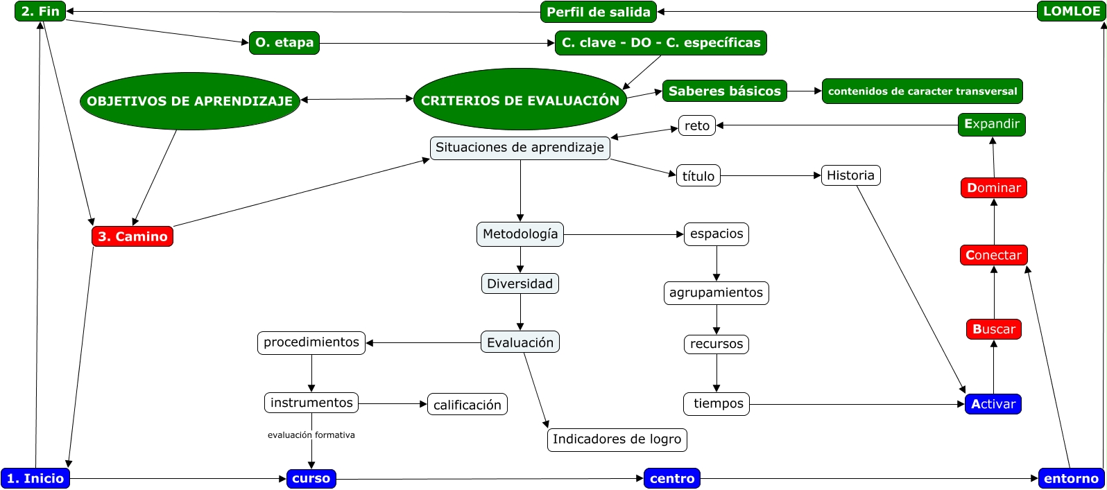 Este Cmap, tiene información relacionada con: 2026 Pizarra PD PS, centro entorno, entorno LOMLOE, Situaciones de aprendizaje título, CRITERIOS DE EVALUACIÓN OBJETIVOS DE APRENDIZAJE, tiempos Activar, Evaluación procedimientos, LOMLOE Perfil de salida, O. etapa C. clave - DO - C. específicas, Perfil de salida 2. Fin, Evaluación Indicadores de logro, Metodología Diversidad, procedimientos instrumentos, título Historia, Metodología espacios, CRITERIOS DE EVALUACIÓN Saberes básicos, 3. Camino Situaciones de aprendizaje, 1. Inicio 2. Fin, Saberes básicos contenidos de caracter transversal, Historia Activar, 3. Camino 1. Inicio