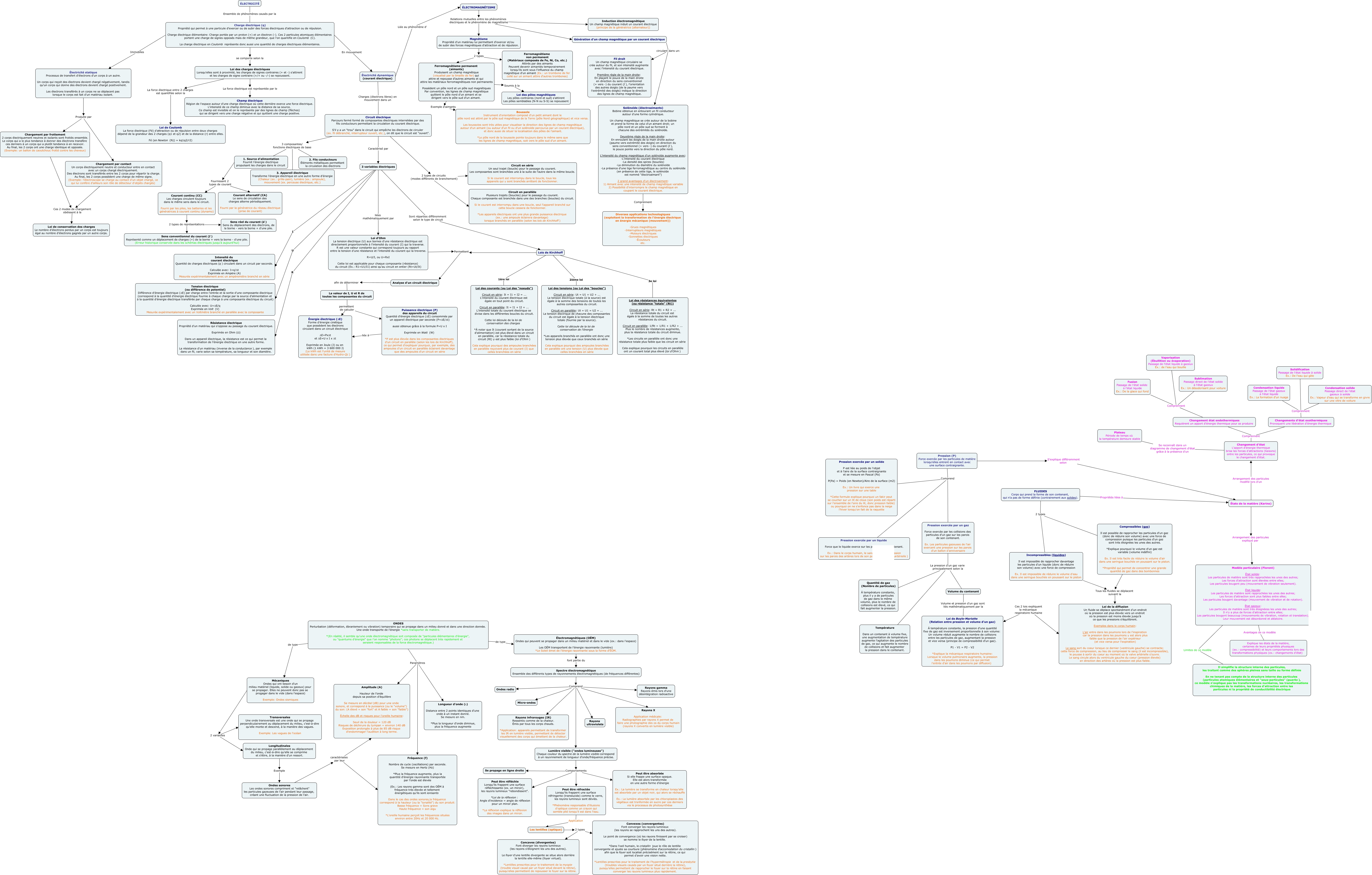 This Concept Map, created with IHMC CmapTools, has information related to: Architecture Umatériel_Concepts D-E-F_Élizabeth, Loi des charges électriques Lorsqu'elles sont à proximité, les charges de signes contraires (+ et -) s'attirent et les charges de signe contraire (+/+ ou -/-) se repoussent. La force électrique est représentée par le Champ électrique Région de l'espace autour d'une charge électrique où cette dernière exerce une force électrique. L'intensité de ce champ diminue avec la distance de sa source. Ce champ est invisible et on le représente par des lignes de champ (flèches) qui se dirigent vers une charge négative et qui quittent une charge positive., États de la matière (Karine) Arrangement des particules expliqué par Modèle particulaire (Florent) État solide: Les particules de matière sont très rapprochées les unes des autres; Les forces d'attraction sont élevées entre elles; Les particules bougent peu (mouvement de vibration seulement). État liquide: Les particules de matière sont rapprochées les unes des autres; Les forces d'attraction sont plus faibles entre elles; Les particules bougent davantage (mouvement de vibration et de rotation). État gazeux: Les particules de matière sont très éloignéess les unes des autres; Il n'y a plus de forces d'attraction entre elles; Les particules bougent beaucoup (mouvements de vibration, rotation et translation); Leur mouvement est désordonné et aléatoire., Électricité statique Processus de transfert d'électrons d'un corps à un autre. Un corps qui reçoit des électrons devient chargé négativement, tandis qu'un corps qui donne des électrons devient chargé positivement. Les électrons transférés à un corps ne se déplacent pas lorsque le corps est fait d'un matériau isolant. Produite par Chargement par contact Un corps électriquement neutre et conducteur entre en contact avec un corps chargé électriquement. Des électrons sont transférés entre les 2 corps pour répartir la charge. Au final, les 2 corps possèdent une charge de même signe. (Exemple: l'électroscope se charge au contact d'un objet chargé, ce qui lui confère d'ailleurs son rôle de détecteur d'objets chargés), Lois de Kirchhoff 3e loi Loi des résistances équivalentes (ou résistance "totale" (Rt)) Circuit en série: Rt = R1 + R2 + ... La résistance totale du circuit est égale à la somme de toutes les autres résistances du circuit. Circuit en parallèle: 1/Rt = 1/R1 + 1/R2 + ... Plus le nombre de résistances augmente, plus la résistance totale du circuit diminue. *Les circuits en parallèle ont donc une résistance totale plus faible que les circuit en série Cela explique pourquoi les circuits en parallèle ont un courant total plus élevé (loi d'Ohm), Puissance électrique (P) des appareils du circuit Quantité d'énergie électrique (ΔE) consommée par un appareil électrique par seconde (P=ΔE/Δt) aussi obtenue grâce à la formule P=U x I Exprimée en Watt (W) *P est plus élevée dans les composantes électriques d'un circuit en parallèle (selon les lois de Kirchhoff), ce qui permet d'expliquer pourquoi, par exemple, des ampoules d'un circuit en parallèle éclairent davantage que des ampoules d'un circuit en série liée à Énergie électrique (ΔE) Forme d'énergie cinétique que possèdent les électrons circulant dans un circuit électrique ΔE=PxΔt et ΔE=U x I x Δt Exprimée en Joule (J) ou en kWh (1 kWh = 3 600 000 J) (Le kWh est l'unité de mesure utilisée dans une facture d'Hydro-Qc), Changement d'état L'apport d'énergie thermique brise les forces d'attractions (liaisons) entre les particules, ce qui provoque le changement d'état. Se reconnaît dans un diagramme de changement d'état grâce à la présence d'un Plateau Période de temps où la température demeure stable, Génération d'un champ magnétique par un courant électrique circulant dans un: Fil droit Un champ magnétique circulaire se crée autour du fil, et son intensité augmente avec l'intensité du courant électrique. Première règle de la main droite: En plaçant le pouce de la main droite en direction du sens conventionnel (+ vers -) du courant (I), l'orientation des autres doigts (de la paume vers l'extrémité des doigts) indique la direction des lignes de champ magnétique., Ferromagnétisme permanent (aimants) Produisent un champ magnétique (visualisé par la limaille de fer) qui attire et repousse d'autres aimants et qui attire les matériaux ferromagnétiques non permanents Possèdent un pôle nord et un pôle sud magnétiques Par convention, les lignes de champ magnétique quittent le pôle nord d'un aimant et se dirigent vers le pôle sud d'un aimant. Exemple d'aimants Boussole Instrument d'orientation composé d'un petit aimant dont le pôle nord est attiré par le pôle sud magnétique de la Terre (pôle Nord géographique) et vice versa. Les boussoles sont très utiles pour visualiser la direction des lignes de champ magnétique autour d'un aimant (ou autour d'un fil ou d'un solénoïde parcourus par un courant électrique), et donc aussi de situer la localisation des pôles de l'aimant. *Le pôle nord de la boussole pointe toujours dans le même sens que les lignes de champ magnétique, soit vers le pôle sud d'un aimant., ÉLECTROMAGNÉTISME Relations mutuelles entre les phénomènes électriques et le phénomène de magnétisme Induction électromagnétique Un champ magnétique induit un courant électrique (principe de la génératrice (alternateur)), Circuit électrique Parcours fermé formé de composantes électriques interreliées par des fils conducteurs permettant la circulation du courant électrique. S'il y a un "trou" dans le circuit qui empêche les électrons de circuler (ex. fil débranché, interrupteur ouvert, etc.), on dit que le circuit est "ouvert". 3 composantes/ fonctions électriques de base 3. Appareil électrique Transforme l'énergie électrique en une autre forme d'éne