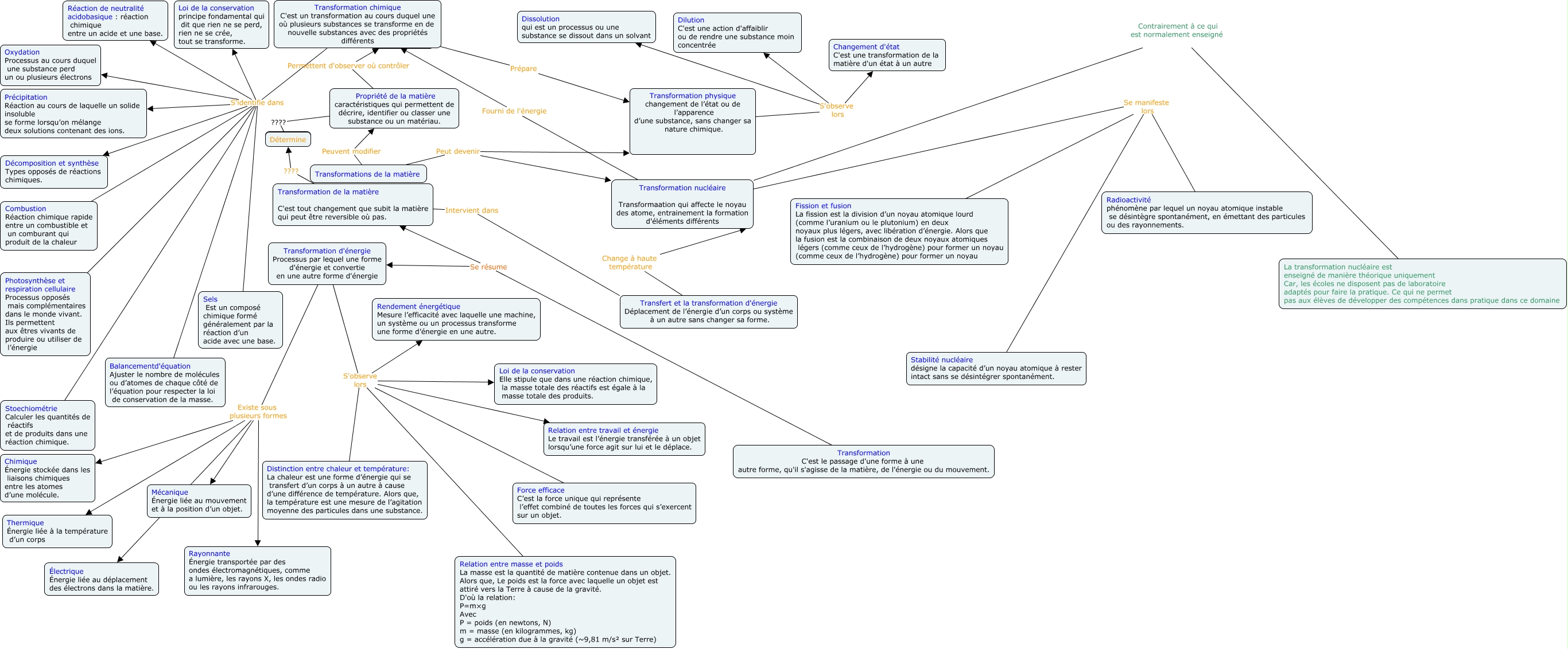This Concept Map, created with IHMC CmapTools, has information related to: Concepts B (transformations)_Florent, Transformation de la matière C'est tout changement que subit la matière qui peut être reversible où pas. Intervient dans Transfert et la transformation d'énergie Déplacement de l’énergie d’un corps ou système à un autre sans changer sa forme., Transformation d'énergie Processus par lequel une forme d'énergie et convertie en une autre forme d'énergie S'observe lors Distinction entre chaleur et température: La chaleur est une forme d’énergie qui se transfert d’un corps à un autre à cause d’une différence de température. Alors que, la température est une mesure de l’agitation moyenne des particules dans une substance., Transformation chimique C'est un transformation au cours duquel une où plusieurs substances se transforme en de nouvelle substances avec des propriétés différents S'identifie dans Photosynthèse et respiration cellulaire Processus opposés mais complémentaires dans le monde vivant. Ils permettent aux êtres vivants de produire ou utiliser de l’énergie, Transformation chimique Prépare Transformation physique changement de l’état ou de l’apparence d’une substance, sans changer sa nature chimique., Transformation d'énergie Processus par lequel une forme d'énergie et convertie en une autre forme d'énergie Existe sous plusieurs formes Rayonnante Énergie transportée par des ondes électromagnétiques, comme a lumière, les rayons X, les ondes radio ou les rayons infrarouges., Transformation d'énergie Processus par lequel une forme d'énergie et convertie en une autre forme d'énergie S'observe lors Rendement énergétique Mesure l’efficacité avec laquelle une machine, un système ou un processus transforme une forme d’énergie en une autre., Transformation physique changement de l’état ou de l’apparence d’une substance, sans changer sa nature chimique. S'observe lors Changement d'état C'est une transformation de la matière d'un état à un autre, Transformation nucléaire Transformaation qui affecte le noyau des atome, entrainement la formation d'éléments différents Contrairement à ce qui est normalement enseigné La transformation nucléaire est enseigné de manière théorique uniquement Car, les écoles ne disposent pas de laboratoire adaptés pour faire la pratique. Ce qui ne permet pas aux élèves de développer des compétences dans pratique dans ce domaine, Transformation d'énergie Processus par lequel une forme d'énergie et convertie en une autre forme d'énergie Existe sous plusieurs formes Thermique Énergie liée à la température d’un corps, Transformation d'énergie Processus par lequel une forme d'énergie et convertie en une autre forme d'énergie S'observe lors Loi de la conservation Elle stipule que dans une réaction chimique, la masse totale des réactifs est égale à la masse totale des produits., Transformation d'énergie Processus par lequel une forme d'énergie et convertie en une autre forme d'énergie Existe sous plusieurs formes Électrique Énergie liée au déplacement des électrons dans la matière., Propriété de la matière caractéristiques qui permettent de décrire, identifier ou classer une substance ou un matériau. Permettent d'observer où contrôler Transformation chimique, Propriété de la matière caractéristiques qui permettent de décrire, identifier ou classer une substance ou un matériau. ???? Détermine, Transformation chimique C'est un transformation au cours duquel une où plusieurs substances se transforme en de nouvelle substances avec des propriétés différents S'identifie dans Sels Est un composé chimique formé généralement par la réaction d’un acide avec une base., Transformation de la matière C'est tout changement que subit la matière qui peut être reversible où pas. ???? Détermine, Transformation physique changement de l’état ou de l’apparence d’une substance, sans changer sa nature chimique. S'observe lors Dissolution qui est un processus ou une substance se dissout dans un solvant, Transformation chimique C'est un transformation au cours duquel une où plusieurs substances se transforme en de nouvelle substances avec des propriétés différents S'identifie dans Précipitation Réaction au cours de laquelle un solide insoluble se forme lorsqu’on mélange deux solutions contenant des ions., Transformation nucléaire Transformaation qui affecte le noyau des atome, entrainement la formation d'éléments différents Se manifeste lors Stabilité nucléaire désigne la capacité d’un noyau atomique à rester intact sans se désintégrer spontanément., Transformation nucléaire Transformaation qui affecte le noyau des atome, entrainement la formation d'éléments différents Se manifeste lors Fission et fusion La fission est la division d’un noyau atomique lourd (comme l’uranium ou le plutonium) en deux noyaux plus légers, avec libération d’énergie. Alors que la fusion est la combinaison de deux noyaux atomiques légers (comme ceux de l’hydrogène) pour former un noyau (comme ceux de l’hydrogène) pour former un noyau, Transformations de la matière Peuvent modifier Propriété de la matière caractéristiques qui permettent de décrire, identifier ou classer une substance ou un matériau.