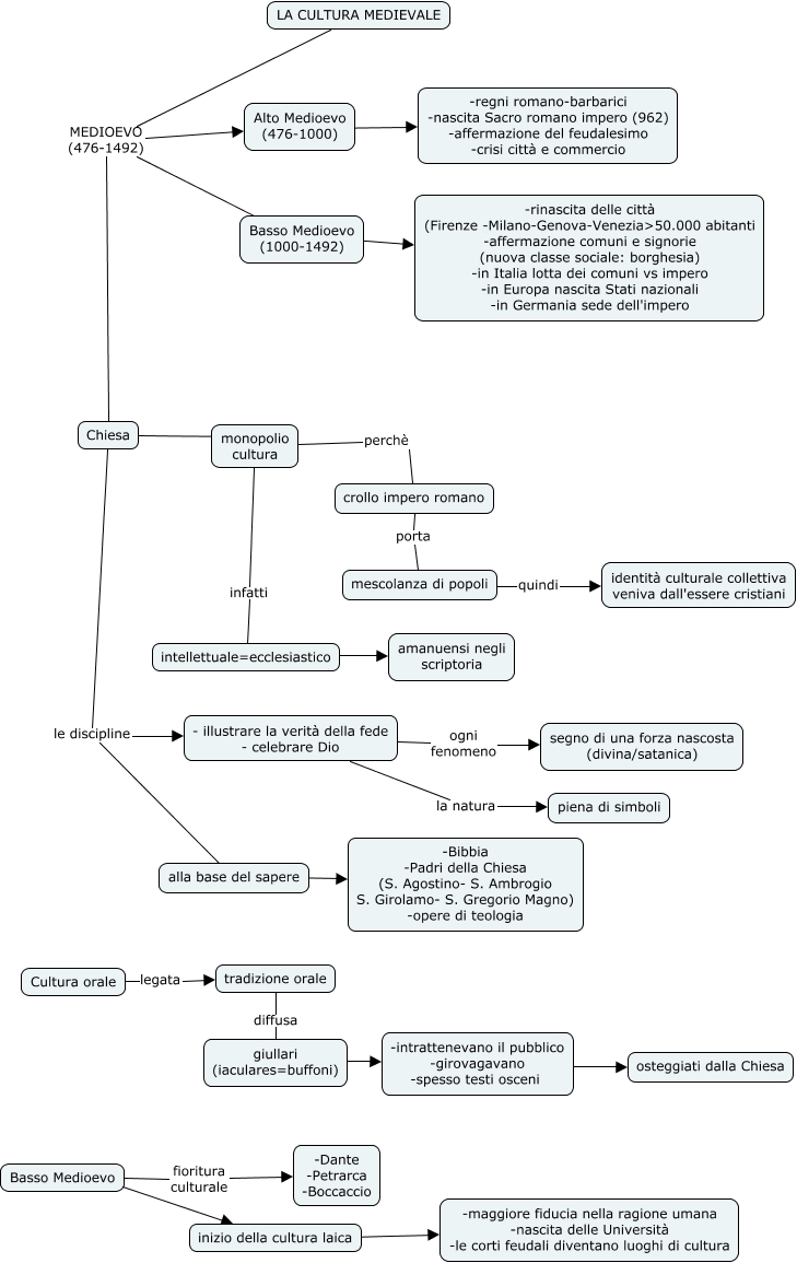 Questa Cmap, creata con IHMC CmapTools, contiene informazioni relative a: 1_La cultura medievale, Basso Medioevo ???? inizio della cultura laica, Basso Medioevo fioritura culturale -Dante -Petrarca -Boccaccio, alla base del sapere ???? -Bibbia -Padri della Chiesa (S. Agostino- S. Ambrogio S. Girolamo- S. Gregorio Magno) -opere di teologia, Chiesa le discipline - illustrare la verità della fede - celebrare Dio, mescolanza di popoli quindi identità culturale collettiva veniva dall'essere cristiani, LA CULTURA MEDIEVALE MEDIOEVO (476-1492) Chiesa, Chiesa le discipline alla base del sapere, LA CULTURA MEDIEVALE MEDIOEVO (476-1492) Alto Medioevo (476-1000), - illustrare la verità della fede - celebrare Dio la natura piena di simboli, crollo impero romano porta mescolanza di popoli, monopolio cultura perchè crollo impero romano, giullari (iaculares=buffoni) ???? -intrattenevano il pubblico -girovagavano -spesso testi osceni, LA CULTURA MEDIEVALE MEDIOEVO (476-1492) Basso Medioevo (1000-1492), intellettuale=ecclesiastico ???? amanuensi negli scriptoria, -intrattenevano il pubblico -girovagavano -spesso testi osceni ???? osteggiati dalla Chiesa, Alto Medioevo (476-1000) ???? -regni romano-barbarici -nascita Sacro romano impero (962) -affermazione del feudalesimo -crisi città e commercio, Basso Medioevo (1000-1492) ???? -rinascita delle città (Firenze -Milano-Genova-Veneziaᡪ.000 abitanti -affermazione comuni e signorie (nuova classe sociale: borghesia) -in Italia lotta dei comuni vs impero -in Europa nascita Stati nazionali -in Germania sede dell'impero, inizio della cultura laica ???? -maggiore fiducia nella ragione umana -nascita delle Università -le corti feudali diventano luoghi di cultura, monopolio cultura infatti intellettuale=ecclesiastico, Chiesa ????