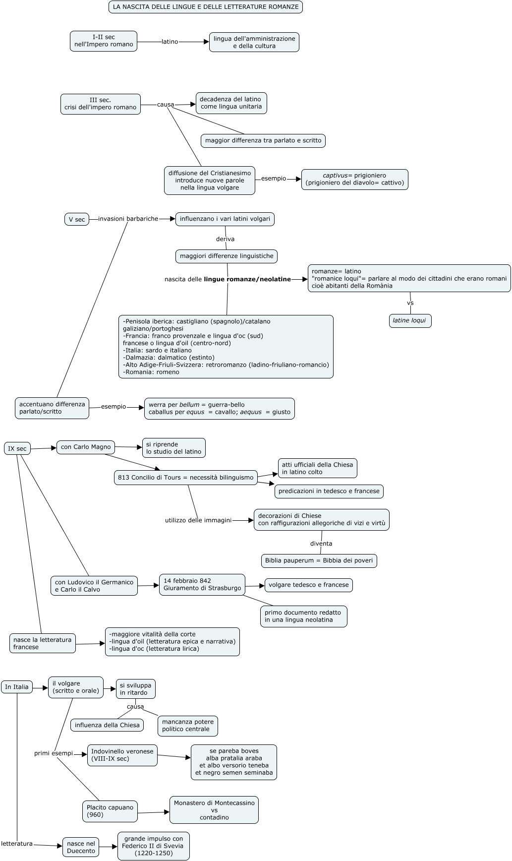 Questa Cmap, creata con IHMC CmapTools, contiene informazioni relative a: 2_La nascita delle lingue e delle letterature, maggiori differenze linguistiche nascita delle lingue romanze/neolatine romanze= latino "romanice loqui"= parlare al modo dei cittadini che erano romani cioè abitanti della Romània, maggiori differenze linguistiche nascita delle lingue romanze/neolatine -Penisola iberica: castigliano (spagnolo)/catalano galiziano/portoghesi -Francia: franco provenzale e lingua d'oc (sud) francese o lingua d'oil (centro-nord) -Italia: sardo e italiano -Dalmazia: dalmatico (estinto) -Alto Adige-Friuli-Svizzera: retroromanzo (ladino-friuliano-romancio) -Romania: romeno, 813 Concilio di Tours = necessità bilinguismo ???? atti ufficiali della Chiesa in latino colto, IX sec ???? nasce la letteratura francese, con Carlo Magno ???? 813 Concilio di Tours = necessità bilinguismo, il volgare (scritto e orale) primi esempi Placito capuano (960), romanze= latino "romanice loqui"= parlare al modo dei cittadini che erano romani cioè abitanti della Romània vs latine loqui, si sviluppa in ritardo causa influenza della Chiesa, In Italia ???? il volgare (scritto e orale), III sec. crisi dell'impero romano causa diffusione del Cristianesimo introduce nuove parole nella lingua volgare, diffusione del Cristianesimo introduce nuove parole nella lingua volgare esempio captivus=prigioniero (prigioniero del diavolo= cattivo), accentuano differenza parlato/scritto esempio werra per bellum= guerra-bello caballus per equus = cavallo; aequus = giusto, nasce nel Duecento ???? grande impulso con Federico II di Svevia (1220-1250), con Ludovico il Germanico e Carlo il Calvo ???? 14 febbraio 842 Giuramento di Strasburgo, si sviluppa in ritardo causa mancanza potere politico centrale, decorazioni di Chiese con raffigurazioni allegoriche di vizi e virtù diventa Biblia pauperum = Bibbia dei poveri, con Carlo Magno ???? si riprende lo studio del latino, Placito capuano (960) ???? Monastero di Montecassino vs contadino, influenzano i vari latini volgari deriva maggiori differenze linguistiche, V sec invasioni barbariche influenzano i vari latini volgari