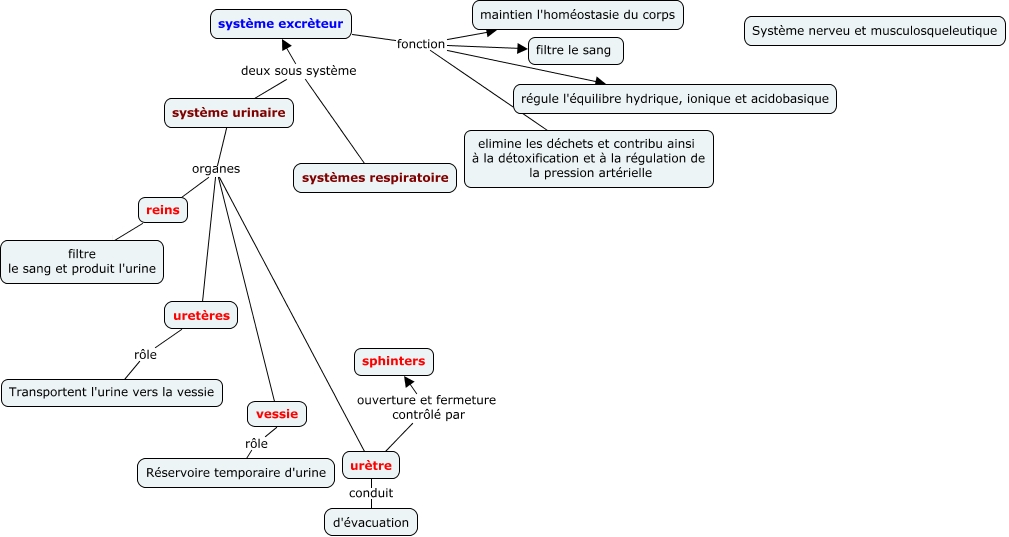 This Concept Map, created with IHMC CmapTools, has information related to: groupe M, système urinaire organes vessie, système urinaire deux sous système systèmes respiratoire, urètre conduit d'évacuation, reins filtre le sang et produit l'urine, système urinaire organes uretères, système excrèteur fonction filtre le sang, système urinaire organes reins, vessie rôle Réservoire temporaire d'urine, système excrèteur fonction régule l'équilibre hydrique, ionique et acidobasique, système urinaire organes urètre, système excrèteur fonction maintien l'homéostasie du corps, système urinaire deux sous système système excrèteur, urètre ouverture et fermeture contrôlé par sphinters, uretères rôle Transportent l'urine vers la vessie, système excrèteur fonction elimine les déchets et contribu ainsi à la détoxification et à la régulation de la pression artérielle