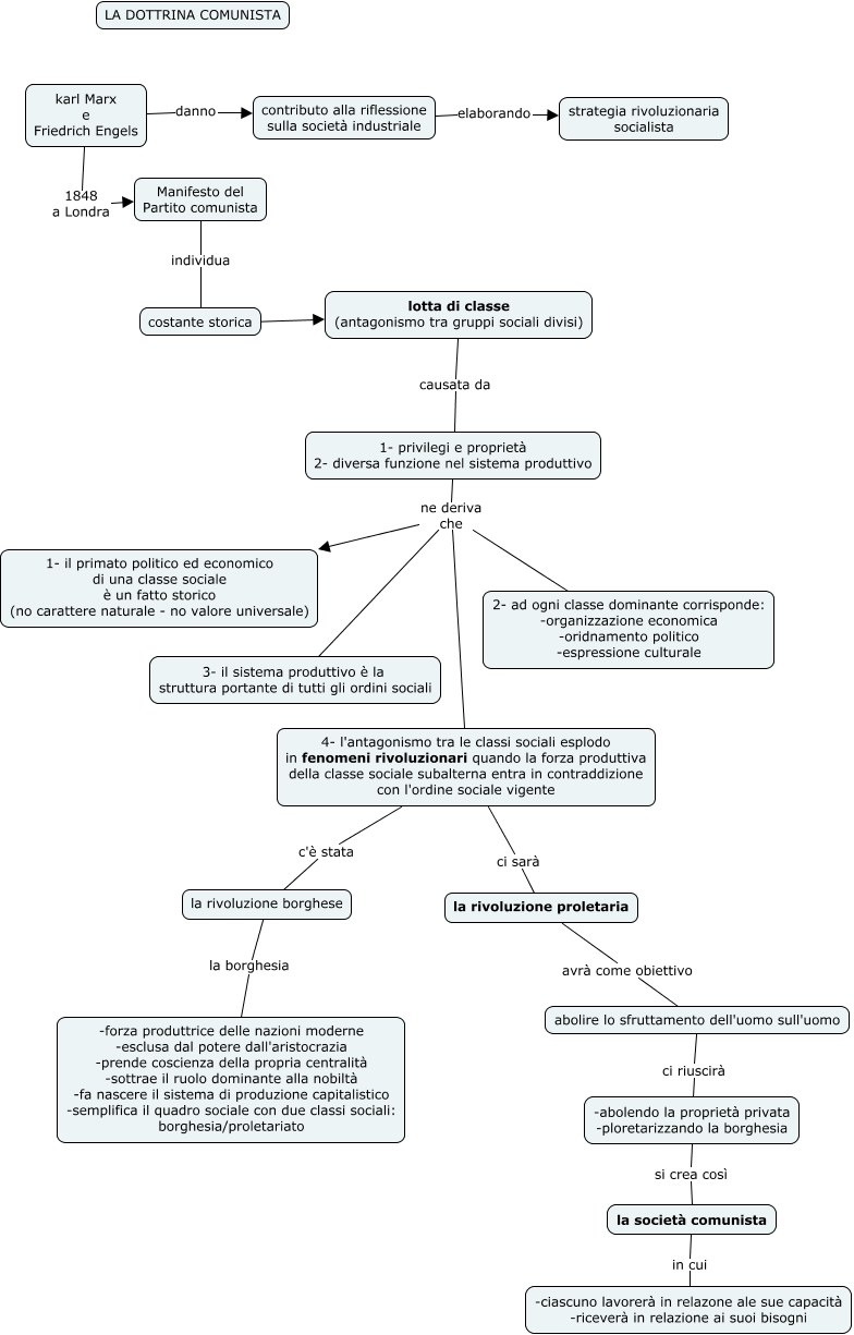 Questa Cmap, creata con IHMC CmapTools, contiene informazioni relative a: La dottrina comunista, lotta di classe (antagonismo tra gruppi sociali divisi) causata da 1- privilegi e proprietà 2- diversa funzione nel sistema produttivo, la rivoluzione proletaria avrà come obiettivo abolire lo sfruttamento dell'uomo sull'uomo, la società comunista in cui -ciascuno lavorerà in relazone ale sue capacità -riceverà in relazione ai suoi bisogni, karl Marx e Friedrich Engels danno contributo alla riflessione sulla società industriale, karl Marx e Friedrich Engels 1848 a Londra Manifesto del Partito comunista, 4- l'antagonismo tra le classi sociali esplodo in fenomeni rivoluzionari quando la forza produttiva della classe sociale subalterna entra in contraddizione con l'ordine sociale vigente c'è stata la rivoluzione borghese, la rivoluzione borghese la borghesia -forza produttrice delle nazioni moderne -esclusa dal potere dall'aristocrazia -prende coscienza della propria centralità -sottrae il ruolo dominante alla nobiltà -fa nascere il sistema di produzione capitalistico -semplifica il quadro sociale con due classi sociali: borghesia/proletariato, 1- privilegi e proprietà 2- diversa funzione nel sistema produttivo ne deriva che 4- l'antagonismo tra le classi sociali esplodo in fenomeni rivoluzionari quando la forza produttiva della classe sociale subalterna entra in contraddizione con l'ordine sociale vigente, 1- privilegi e proprietà 2- diversa funzione nel sistema produttivo ne deriva che 1- il primato politico ed economico di una classe sociale è un fatto storico (no carattere naturale - no valore universale), 1- privilegi e proprietà 2- diversa funzione nel sistema produttivo ne deriva che 3- il sistema produttivo è la struttura portante di tutti gli ordini sociali, 1- privilegi e proprietà 2- diversa funzione nel sistema produttivo ne deriva che 2- ad ogni classe dominante corrisponde: -organizzazione economica -oridnamento politico -espressione culturale, 4- l'antagonismo tra le classi sociali esplodo in fenomeni rivoluzionari quando la forza produttiva della classe sociale subalterna entra in contraddizione con l'ordine sociale vigente ci sarà la rivoluzione proletaria, costante storica ???? lotta di classe (antagonismo tra gruppi sociali divisi), contributo alla riflessione sulla società industriale elaborando strategia rivoluzionaria socialista, -abolendo la proprietà privata -ploretarizzando la borghesia si crea così la società comunista, abolire lo sfruttamento dell'uomo sull'uomo ci riuscirà -abolendo la proprietà privata -ploretarizzando la borghesia, Manifesto del Partito comunista individua costante storica