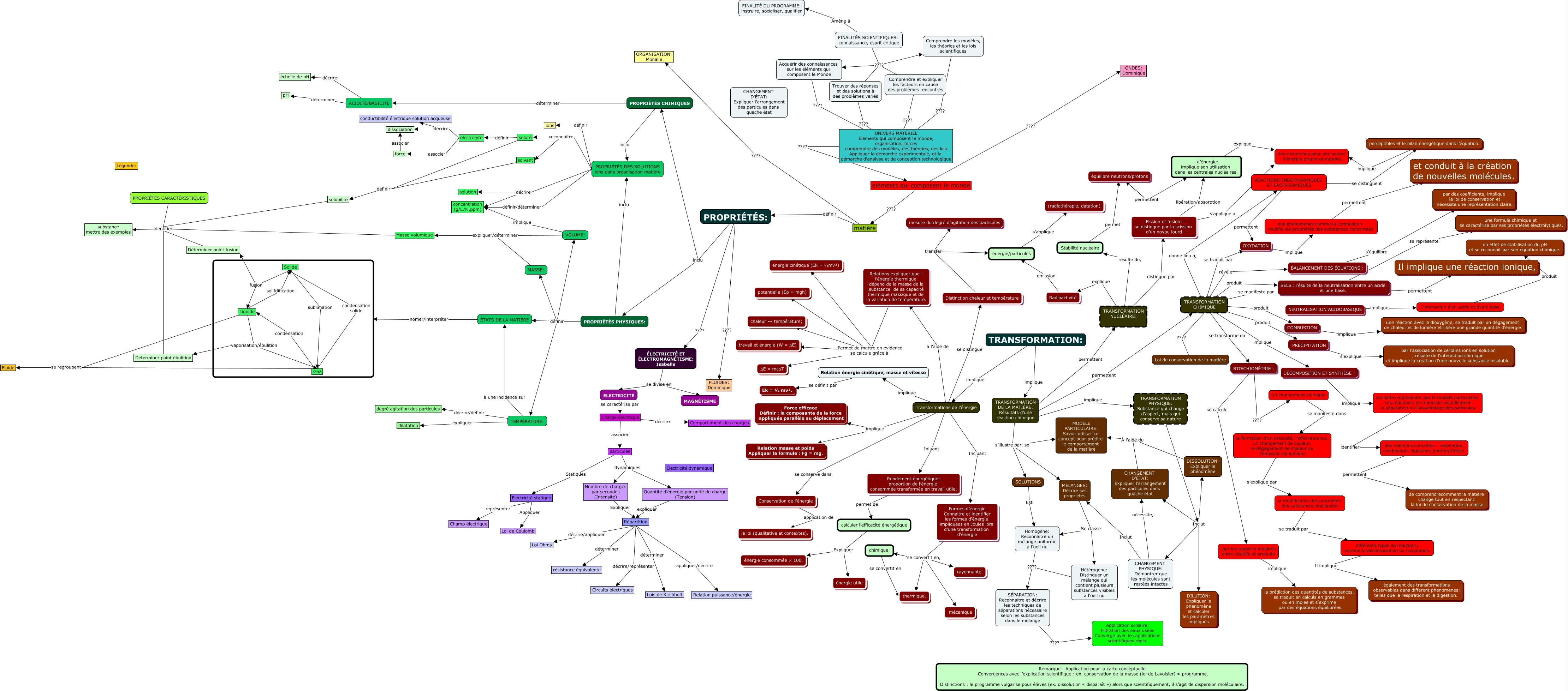 Cette carte de concepts créée avec IHMC CmapTools traite de: Équipe I carte à utiliser Emili, Solide sublimation Gaz, TRANSFORMATION CHIMIQUE produit, PRÉCIPITATION, PROPRIÉTÉS PHYSIQUES: définir VOLUME:, Formes d’énergie Connaitre et identifier les formes d'énergie impliquées en Joules lors d'une transformation d'énergie se convertit en, mécanique, matière définir PROPRIÉTÉS:, UNIVERS MATÉRIEL Elements qui composent le monde, organisation, forces comprendre des modèles, des théories, des lois Appliquer la démarche expérimentale, et la démarche d'analyse et de conception technologique ???? eléments qui composent le monde, des phénomènes comme la combustion modifie les propriétés des substances concernées permettent et conduit à la création de nouvelles molécules., Quantité d'énergie par unité de charge (Tension) expliquer Répartition, Transformations de l’énergie implique Relation masse et poids Appliquer la formule : Fg = mg., Répartition déterminer résistance équivalente, différents types de réactions, comme la décomposition ou l’oxydation. Il implique également des transformations observables dans different phenomenes: telles que la respiration et la digestion., SELS : résulte de la neutralisation entre un acide et une base. permettent Il implique une réaction ionique,, Liquide vaporisation/ébulition Déterminer point ébulition, Gaz condensation solide Solide, CHANGEMENT D'ÉTAT: Expliquer l'arrangement des particules dans quache état À l'aide du MODÈLE PARTICULAIRE: Savoir utiliser ce concept pour prédire le comportement de la matière, eléments qui composent le monde ???? ONDES: Dominique, des réactions concrètes : respiration, combustion, digestion, photosynthèse. permettent de comprendrecomment la matière change tout en respectant la loi de conservation de la masse, electrolyte décrire dissociation, ACIDITÉ/BASICITÉ décrire échelle de pH, solvant définir solubilité