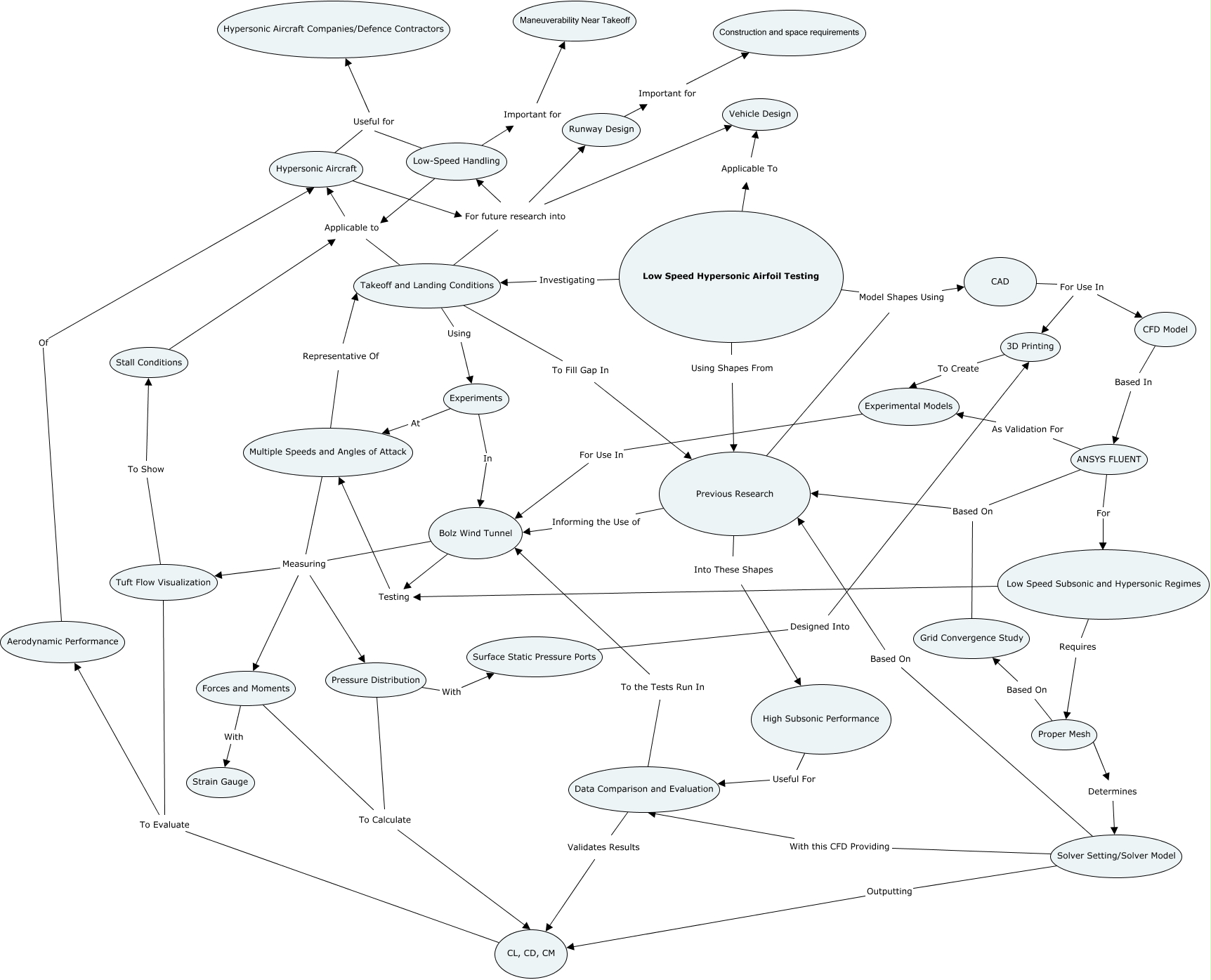 This Concept Map, created with IHMC CmapTools, has information related to: Concept Map, Previous Research Into These Shapes High Subsonic Performance, Takeoff and Landing Conditions Applicable to Hypersonic Aircraft, Experimental Models For Use In Bolz Wind Tunnel, Solver Setting/Solver Model With this CFD Providing Data Comparison and Evaluation, Low-Speed Handling Important for Maneuverability Near Takeoff, Multiple Speeds and Angles of Attack Measuring Forces and Moments, Low Speed Hypersonic Airfoil Testing Investigating Takeoff and Landing Conditions, Hypersonic Aircraft Useful for Hypersonic Aircraft Companies/Defence Contractors, Pressure Distribution With Surface Static Pressure Ports, Low Speed Hypersonic Airfoil Testing Model Shapes Using CAD, Bolz Wind Tunnel Testing Multiple Speeds and Angles of Attack, Experiments At Multiple Speeds and Angles of Attack, Low Speed Subsonic and Hypersonic Regimes Testing Multiple Speeds and Angles of Attack, Solver Setting/Solver Model Outputting CL, CD, CM, Pressure Distribution To Calculate CL, CD, CM, CAD For Use In CFD Model, Bolz Wind Tunnel Measuring Pressure Distribution, Previous Research Informing the Use of Bolz Wind Tunnel, Forces and Moments To Calculate CL, CD, CM, Low-Speed Handling Useful for Hypersonic Aircraft Companies/Defence Contractors