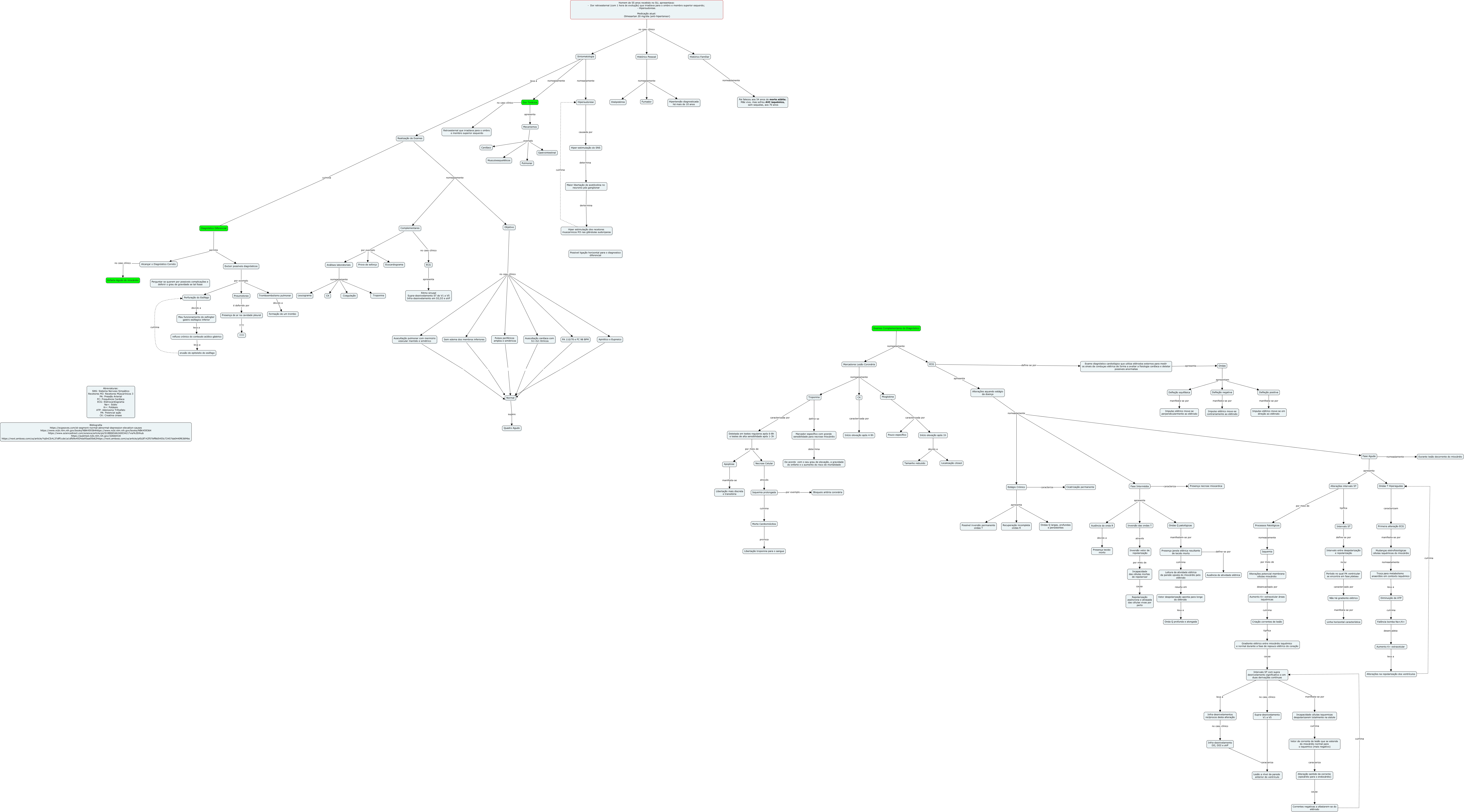 Esse mapa conceitual, produzido no IHMC CmapTools, tem a informação relacionada a: Mapa SCA 21 00,30, Marcadores Lesão Coronária nomeadamente CK, Alteração sentido da corrente (epicárdio para o endocárdio) causa Correntes negativas a afastarem-se do elétrodo, Auscultação pulmonar com mermúrio vesicular mantido e simétrico Normal, Diminuição de ATP culmina Falência bomba Na+/K+, Complementares por exemplo Prova de esforço, Marcador específico com grande sensibilidade para necrose miocárdio determina De acordo com o seu grau de elevação, a gravidade do enfarte e o aumento do risco de mortalidade, Ondas T Hiperagudas caracterizam Primeira alteração ECG, Homem de 55 anos recebido no SU, apresentava: - Dor retroesternal (com 1 hora de evolução) que irradiava para o ombro e membro superior esquerdo; - Hipersudorese. Medicação atual: Olmesartan 20 mg/dia (anti-hipertensor) no caso clínico Histórico Famíliar, Complementares no caso clínico ECG, Mecanismos exemplo Musculoesqueléticos, Primeira alteração ECG manifesta-se por Mudanças eletrofisiológicas células isquémicas do miocárdio, Fase Aguda apresenta Ondas T Hiperagudas, erusão do epitelelio do esófago culmina Perfuração do Esófago, Início elevação após 1h devido a Tamanho reduzido, Objetivo no caso clínico PA 110/70 e FC 98 BPM, Início elevação após 1h devido a Localização citosol, Excluir possíveis diagnósticos por exemplo Perfuração do Esófago, Marcadores Lesão Coronária nomeadamente Mioglobina, Auscultação cardíaca com S1+S2 ritmícos Normal, Inversão das ondas T através Inversão vetor de repolarização