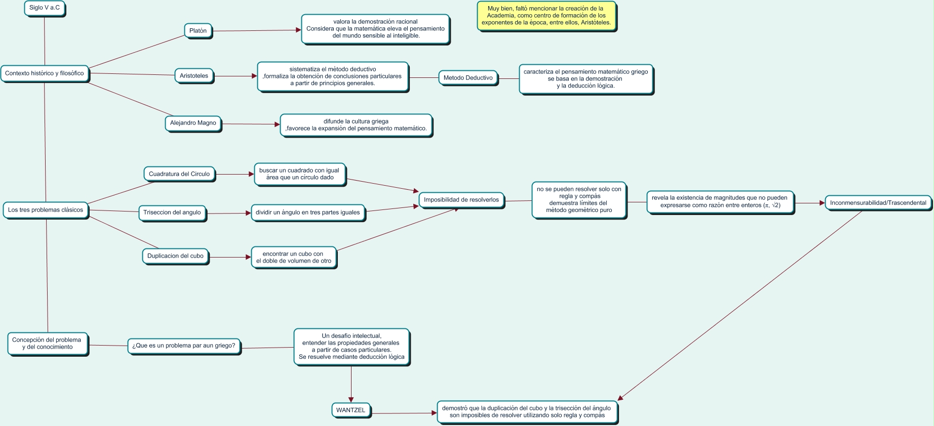This Concept Map, created with IHMC CmapTools, has information related to: SIGLO V a.C, Los tres problemas clásicos ???? Concepción del problema y del conocimiento, Contexto histórico y filosófico ???? Los tres problemas clásicos, Contexto histórico y filosófico ???? Alejandro Magno, Contexto histórico y filosófico ???? Platón, WANTZEL ???? demostró que la duplicación del cubo y la trisección del ángulo son imposibles de resolver utilizando solo regla y compás, Metodo Deductivo ???? caracteriza el pensamiento matemático griego se basa en la demostración y la deducción lógica., Contexto histórico y filosófico ???? Aristoteles, Imposibilidad de resolverlos ???? no se pueden resolver solo con regla y compás demuestra límites del método geométrico puro, Duplicacion del cubo ???? encontrar un cubo con el doble de volumen de otro, Platón ???? valora la demostración racional Considera que la matemática eleva el pensamiento del mundo sensible al inteligible., Concepción del problema y del conocimiento ???? ¿Que es un problema par aun griego?, dividir un ángulo en tres partes iguales ???? Imposibilidad de resolverlos, Los tres problemas clásicos ???? Cuadratura del Circulo, revela la existencia de magnitudes que no pueden expresarse como razón entre enteros (π, √2) ???? Inconmensurabilidad/Trascendental, no se pueden resolver solo con regla y compás demuestra límites del método geométrico puro ???? revela la existencia de magnitudes que no pueden expresarse como razón entre enteros (π, √2), sistematiza el método deductivo ,formaliza la obtención de conclusiones particulares a partir de principios generales. ???? Metodo Deductivo, Siglo V a.C ???? Contexto histórico y filosófico, ¿Que es un problema par aun griego? ???? Un desafio intelectual, entender las propiedades generales a partir de casos particulares. Se resuelve mediante deducción lógica, Los tres problemas clásicos ???? Triseccion del angulo, Cuadratura del Circulo ???? buscar un cuadrado con igual área que un círculo dado
