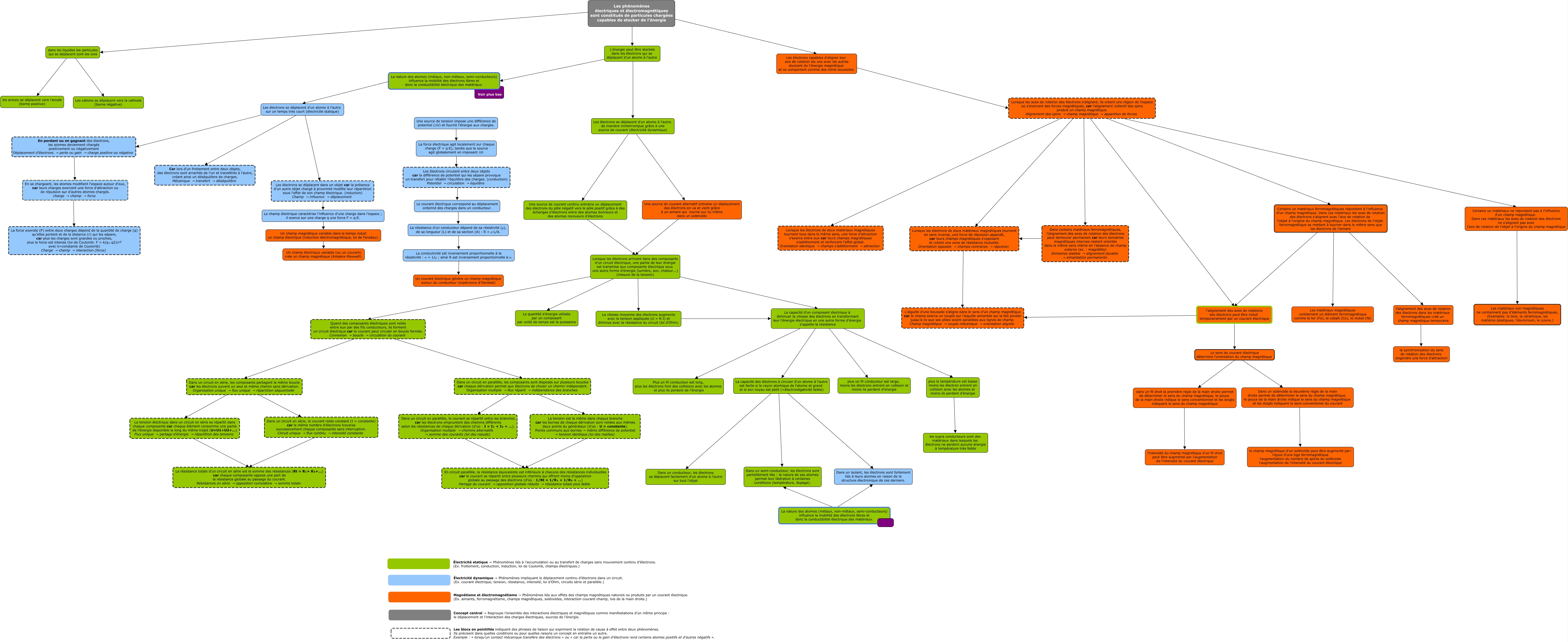 Cette carte de concepts créée avec IHMC CmapTools traite de: Équipe_T3_8_carte_corrections_IG_DOM27oct, Une source de courant continu entraine un déplacement des électrons du pôle négatif vers le pôle positif grâce à des échanges d'électrons entre des atomes donneurs et des atomes receveurs d'électrons ???? Lorsque les électrons arrivent dans des composants d'un circuit électrique, une partie de leur énergie est transmise aux composants électrique sous une autre forme d'énergie (lumière, son, chaleur...) (mesure de la tension), Les électrons se déplacent d'un atome à l'autre sur un temps très court (électricité statique) ???? Les électrons se déplacent dans un objet car la présence d’un autre objet chargé à proximité modifie leur répartition sous l’effet de son champ électrique. (induction) Champ → influence → déplacement, Certains un matériaux ferromagnétiques répondent à l'influence d'un champ magnétique. Dans ces matériaux les axes de rotation des électrons s'alignent avec l'axe de rotation de l'objet à l'origine du champ magnétique. Les électrons de l'objet ferromagnétique se mettent à tourner dans le même sens que les électrons de l'aimant ???? l'alignement des axes de rotation des électrons dans les matériaux ferromagnétiques créé un champ magnétique temporaire, Certains un matériaux ferromagnétiques répondent à l'influence d'un champ magnétique. Dans ces matériaux les axes de rotation des électrons s'alignent avec l'axe de rotation de l'objet à l'origine du champ magnétique. Les électrons de l'objet ferromagnétique se mettent à tourner dans le même sens que les électrons de l'aimant ???? Les matériaux magnétiques contiennent un élément ferromagnétique comme le fer (Fe), le cobalt (Co), le nickel (Ni), Les phénomènes électriques et électromagnétiques sont constitués de particules chargées capables de stocker de l'énergie ???? dans les liquides les particules qui se déplacent sont les ions, La capacité des électrons à circuler d'un atome à l'autre est facile si le rayon atomique de l'atome et grand et si son noyau est petit (=électronégativité faible) ???? Dans un conducteur, les électrons se déplacent facilement d'un atome à l'autre sur tout l'objet, Lorsque les électrons arrivent dans des composants d'un circuit électrique, une partie de leur énergie est transmise aux composants électrique sous une autre forme d'énergie (lumière, son, chaleur...) (mesure de la tension) ???? La quantité d'énergie utilisée par un composant par unité de temps est la puissance, Lorsque les axes de rotation des électrons s’alignent, ils créent une région de l’espace où s’exercent des forces magnétiques, car l’alignement collectif des spins produit un champ magnétique. Alignement des spins → champ magnétique → apparition de forces ???? Lorsque les électrons de deux matériaux magnétiques tournent en sens inverse, une force de répulsion apparaît, car leurs champs magnétiques s’opposent et créent une zone de résistance mutuelle. Orientation opposée → champs contraires → répulsion, Une source de courant alternatif entraine un déplacement des électrons en va et vient grâce à un aimant qui tourne sur lui même dans un solénoïde ???? Lorsque les électrons arrivent dans des composants d'un circuit électrique, une partie de leur énergie est transmise aux composants électrique sous une autre forme d'énergie (lumière, son, chaleur...) (mesure de la tension), Les électrons capables d'aligner leur axe de rotation les uns avec les autres stockent de l'énergie magnétique et se comportent comme des minis boussoles ???? Lorsque les axes de rotation des électrons s’alignent, ils créent une région de l’espace où s’exercent des forces magnétiques, car l’alignement collectif des spins produit un champ magnétique. Alignement des spins → champ magnétique → apparition de forces, Lorsque les axes de rotation des électrons s’alignent, ils créent une région de l’espace où s’exercent des forces magnétiques, car l’alignement collectif des spins produit un champ magnétique. Alignement des spins → champ magnétique → apparition de forces ???? l'alignement des axes de rotations des électrons peut être induit temporairement par un courant électrique, Lorsque les électrons arrivent dans des composants d'un circuit électrique, une partie de leur énergie est transmise aux composants électrique sous une autre forme d'énergie (lumière, son, chaleur...) (mesure de la tension) ???? Quand des composants électriques sont reliés entre eux par des fils conducteurs, ils forment un circuit électrique car le courant peut circuler en boucle fermée. Connexion → boucle → circulation du courant, Dans un solénoïde la deuxième règle de la main droite permet de déterminer le sens du champ magnétique, le pouce de la main droite indique le sens du champ magnétique et les doigts indiquent le sens conventionel du courant ???? le champ magnétique d'un solénoïde peut être augmenté par: l'ajout d'une tige ferromagnétique l'augmentation du nombre de spires du solénoide l'augmentation de l'intensité du courant électrique, La nature des atomes (métaux, non-métaux, semi-conducteurs) influence la mobilité des électrons libres et donc la conductibilité électrique des matériaux. ???? Dans un isolant, les électrons sont fortement liés à leurs atomes en raison de la structure électronique de ces derniers., dans les liquides les particules qui se déplacent sont les ions ???? les anions se déplacent vers l'anode (borne positive), La résistance d’un conducteur dépend de sa résistivité (ρ), de sa longueur (L) et de sa section (A) : R = ρ·L/A. ???? La conductivité est inversement proportionnelle à la résistivité : σ = 1/ρ ; ainsi R est inversement proportionnelle à σ., La vitesse moyenne des électrons augmente avec la te