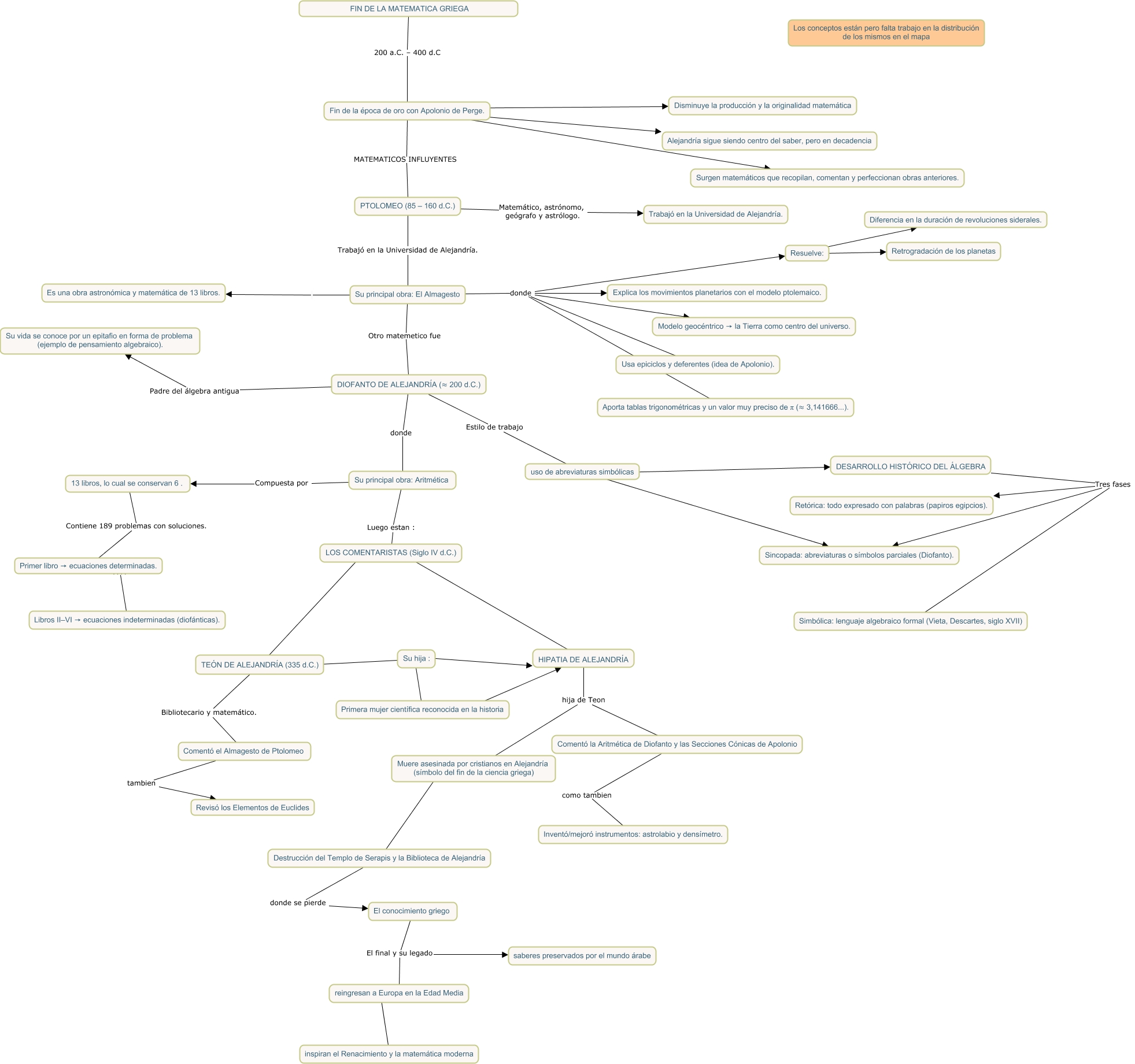 This Concept Map, created with IHMC CmapTools, has information related to: fin de la matematica griega, uso de abreviaturas simbólicas ???? Sincopada: abreviaturas o símbolos parciales (Diofanto)., Su principal obra: El Almagesto Es una obra astronómica y matemática de 13 libros., DIOFANTO DE ALEJANDRÍA (≈ 200 d.C.) Padre del álgebra antigua Su vida se conoce por un epitafio en forma de problema (ejemplo de pensamiento algebraico)., Su principal obra: El Almagesto Otro matemetico fue DIOFANTO DE ALEJANDRÍA (≈ 200 d.C.), El conocimiento griego El final y su legado reingresan a Europa en la Edad Media, Primera mujer científica reconocida en la historia ???? HIPATIA DE ALEJANDRÍA, Resuelve: ???? Retrogradación de los planetas, PTOLOMEO (85 – 160 d.C.) Matemático, astrónomo, geógrafo y astrólogo. Trabajó en la Universidad de Alejandría., Su principal obra: El Almagesto donde Usa epiciclos y deferentes (idea de Apolonio)., Comentó la Aritmética de Diofanto y las Secciones Cónicas de Apolonio como tambien Inventó/mejoró instrumentos: astrolabio y densímetro., Fin de la época de oro con Apolonio de Perge. ???? Alejandría sigue siendo centro del saber, pero en decadencia, El conocimiento griego El final y su legado saberes preservados por el mundo árabe, Fin de la época de oro con Apolonio de Perge. MATEMATICOS INFLUYENTES PTOLOMEO (85 – 160 d.C.), DIOFANTO DE ALEJANDRÍA (≈ 200 d.C.) donde Su principal obra: Aritmética, Su principal obra: El Almagesto donde Explica los movimientos planetarios con el modelo ptolemaico., DESARROLLO HISTÓRICO DEL ÁLGEBRA Tres fases Retórica: todo expresado con palabras (papiros egipcios)., HIPATIA DE ALEJANDRÍA hija de Teon Comentó la Aritmética de Diofanto y las Secciones Cónicas de Apolonio, Su hija : ???? TEÓN DE ALEJANDRÍA (335 d.C.), Su principal obra: El Almagesto donde Resuelve:, Su hija : ???? HIPATIA DE ALEJANDRÍA