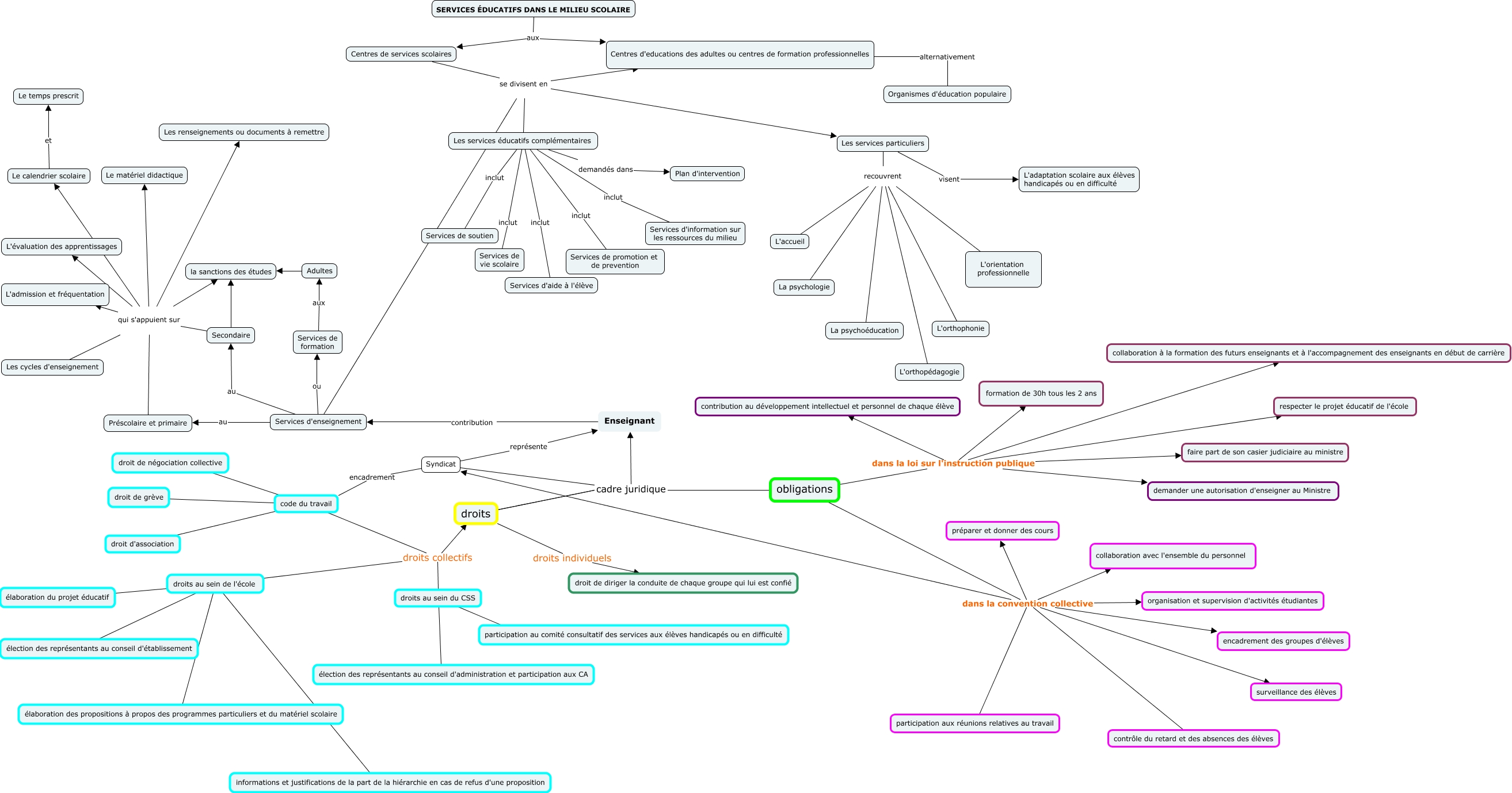 This Concept Map, created with IHMC CmapTools, has information related to: CMAP Équipe 11, Les services particuliers recouvrent La psychologie, Syndicat représente Enseignant, Le calendrier scolaire et Le temps prescrit, obligations dans la loi sur l'instruction publique respecter le projet éducatif de l'école, Préscolaire et primaire qui s'appuient sur Les cycles d'enseignement, droits au sein de l'école droits collectifs droits, Préscolaire et primaire qui s'appuient sur Les renseignements ou documents à remettre, Centres de services scolaires se divisent en Services d'enseignement, Les services éducatifs complémentaires inclut Services d'aide à l'élève, Centres de services scolaires se divisent en Les services éducatifs complémentaires, droits au sein de l'école ???? élaboration des propositions à propos des programmes particuliers et du matériel scolaire, Les services particuliers recouvrent L'orientation professionnelle, obligations dans la convention collective contrôle du retard et des absences des élèves, droits au sein du CSS droits collectifs droits, droits au sein du CSS ???? participation au comité consultatif des services aux élèves handicapés ou en difficulté, Les services éducatifs complémentaires inclut Services de soutien, Secondaire qui s'appuient sur la sanctions des études, Secondaire qui s'appuient sur L'admission et fréquentation, obligations dans la loi sur l'instruction publique contribution au développement intellectuel et personnel de chaque élève, droits cadre juridique Enseignant