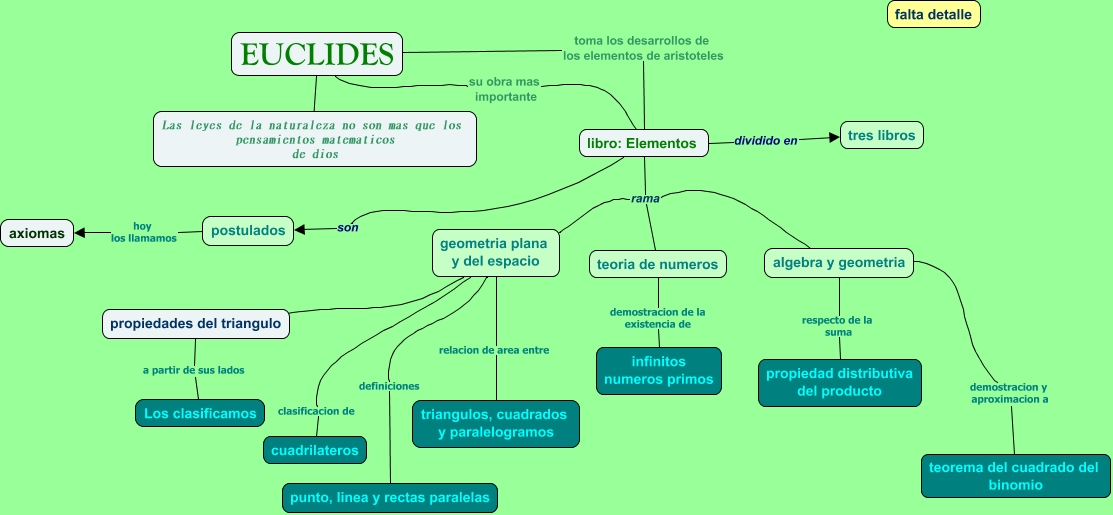 This Concept Map, created with IHMC CmapTools, has information related to: Euclides, teoria de numeros demostracion de la existencia de infinitos numeros primos, libro: Elementos rama teoria de numeros, libro: Elementos rama geometria plana y del espacio, libro: Elementos dividido en tres libros, geometria plana y del espacio ???? propiedades del triangulo, libro: Elementos rama algebra y geometria, algebra y geometria respecto de la suma propiedad distributiva del producto, geometria plana y del espacio definiciones punto, linea y rectas paralelas, EUCLIDES ???? Las leyes de la naturaleza no son mas que los pensamientos matematicos de dios, postulados hoy los llamamos axiomas, EUCLIDES su obra mas importante libro: Elementos, geometria plana y del espacio clasificacion de cuadrilateros, EUCLIDES toma los desarrollos de los elementos de aristoteles libro: Elementos, libro: Elementos son postulados, propiedades del triangulo a partir de sus lados Los clasificamos, algebra y geometria demostracion y aproximacion a teorema del cuadrado del binomio, geometria plana y del espacio relacion de area entre triangulos, cuadrados y paralelogramos