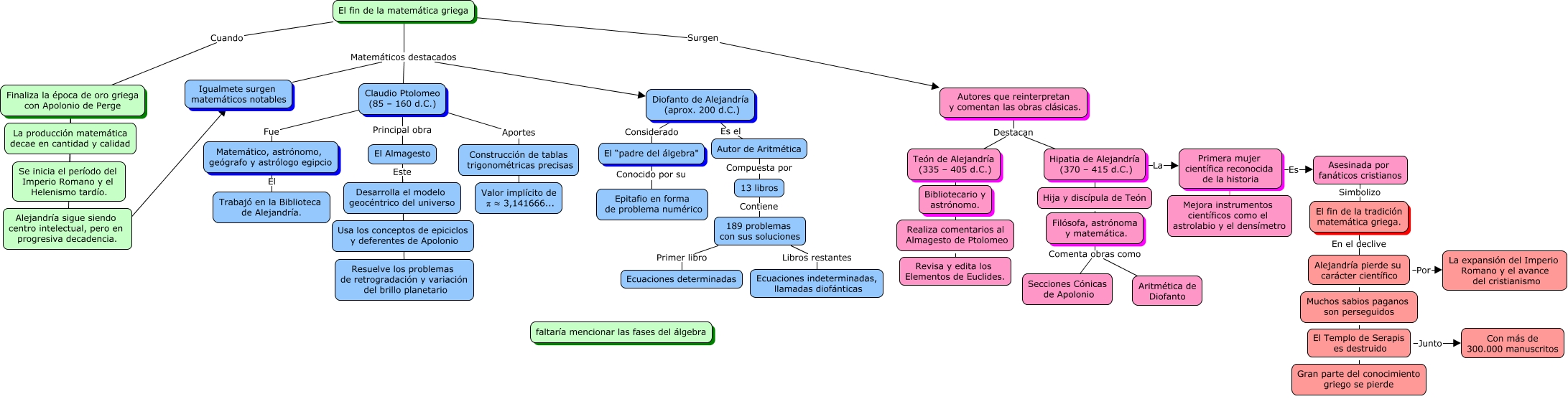 This Concept Map, created with IHMC CmapTools, has information related to: El fin de la matemática griega, Teón de Alejandría (335 – 405 d.C.) ???? Bibliotecario y astrónomo., Autor de Aritmética Compuesta por 13 libros, El fin de la tradición matemática griega. En el declive Muchos sabios paganos son perseguidos, Claudio Ptolomeo (85 – 160 d.C.) Aportes Valor implícito de π ≈ 3,141666..., Primera mujer científica reconocida de la historia Mejora instrumentos científicos como el astrolabio y el densímetro, Diofanto de Alejandría (aprox. 200 d.C.) Es el Autor de Aritmética, Finaliza la época de oro griega con Apolonio de Perge ???? La producción matemática decae en cantidad y calidad, El fin de la tradición matemática griega. En el declive Gran parte del conocimiento griego se pierde, Autores que reinterpretan y comentan las obras clásicas. Destacan Teón de Alejandría (335 – 405 d.C.), Hipatia de Alejandría (370 – 415 d.C.) ???? Hija y discípula de Teón, Hipatia de Alejandría (370 – 415 d.C.) La Primera mujer científica reconocida de la historia, Teón de Alejandría (335 – 405 d.C.) ???? Revisa y edita los Elementos de Euclides., Primera mujer científica reconocida de la historia Es Asesinada por fanáticos cristianos, Autores que reinterpretan y comentan las obras clásicas. Destacan Hipatia de Alejandría (370 – 415 d.C.), Teón de Alejandría (335 – 405 d.C.) ???? Realiza comentarios al Almagesto de Ptolomeo, Finaliza la época de oro griega con Apolonio de Perge ???? Alejandría sigue siendo centro intelectual, pero en progresiva decadencia., 13 libros Contiene 189 problemas con sus soluciones, Alejandría pierde su carácter científico Por La expansión del Imperio Romano y el avance del cristianismo, El fin de la matemática griega Surgen Autores que reinterpretan y comentan las obras clásicas., Igualmete surgen matemáticos notables Matemáticos destacados Claudio Ptolomeo (85 – 160 d.C.)