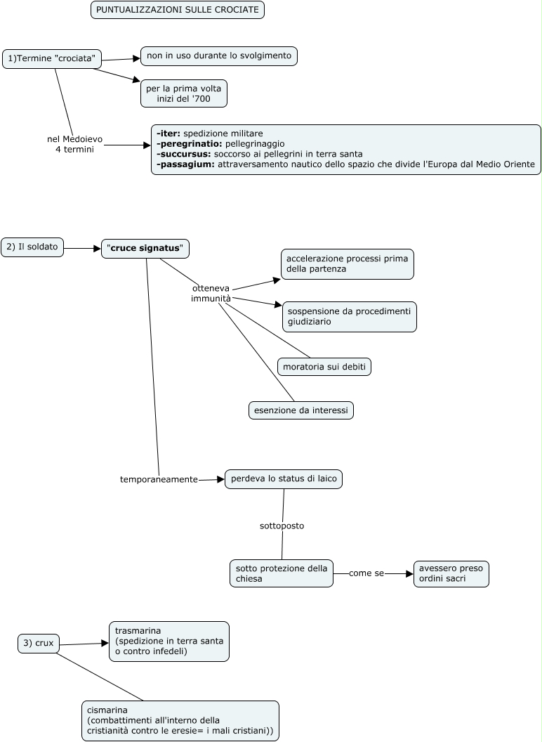 Questa Cmap, creata con IHMC CmapTools, contiene informazioni relative a: precisazioni, 2) Il soldato ???? "cruce signatus", 3) crux ???? trasmarina (spedizione in terra santa o contro infedeli), 1)Termine "crociata" ???? non in uso durante lo svolgimento, "cruce signatus" otteneva immunità accelerazione processi prima della partenza, "cruce signatus" temporaneamente perdeva lo status di laico, sotto protezione della chiesa come se avessero preso ordini sacri, 1)Termine "crociata" ???? per la prima volta inizi del '700, "cruce signatus" otteneva immunità moratoria sui debiti, 3) crux ???? cismarina (combattimenti all'interno della cristianità contro le eresie= i mali cristiani)), "cruce signatus" otteneva immunità esenzione da interessi, perdeva lo status di laico sottoposto sotto protezione della chiesa, 1)Termine "crociata" nel Medoievo 4 termini -iter: spedizione militare -peregrinatio: pellegrinaggio -succursus: soccorso ai pellegrini in terra santa -passagium: attraversamento nautico dello spazio che divide l'Europa dal Medio Oriente, "cruce signatus" otteneva immunità sospensione da procedimenti giudiziario