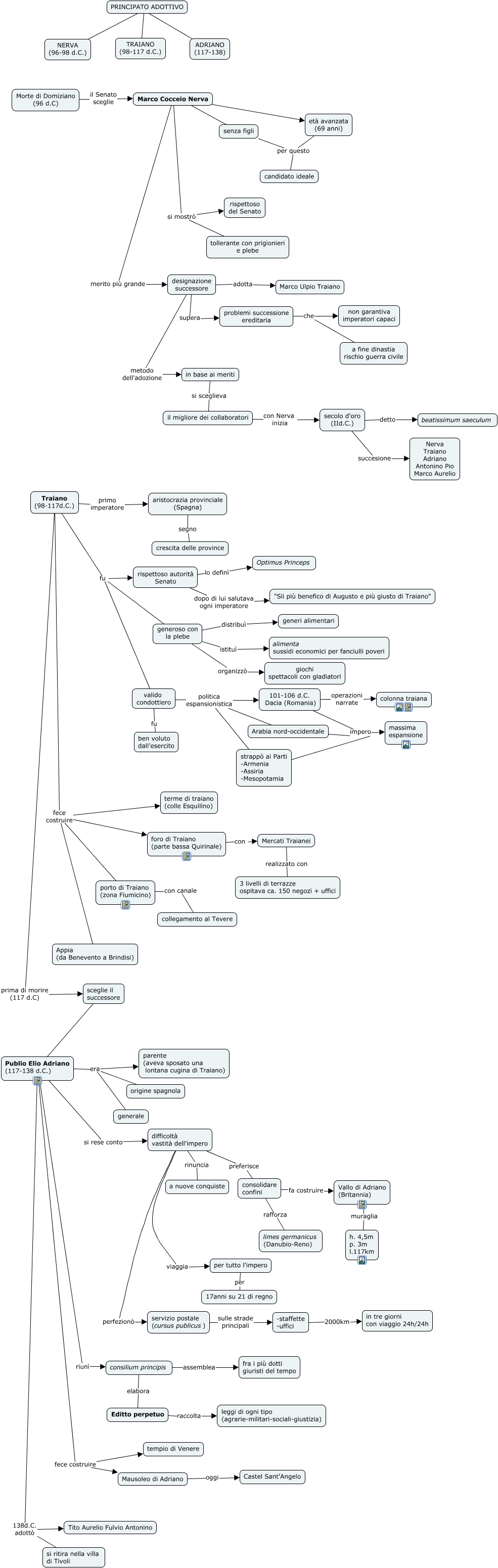 Questa Cmap, creata con IHMC CmapTools, contiene informazioni relative a: 2) Principato adottivo, Traiano (98-117d.C.) fece costruire porto di Traiano (zona Fiumicino), valido condottiero politica espansionistica Arabia nord-occidentale, designazione successore adotta Marco Ulpio Traiano, Traiano (98-117d.C.) fu valido condottiero, generoso con la plebe istituì alimenta sussidi economici per fanciulli poveri, in base ai meriti si sceglieva il migliore dei collaboratori, per tutto l'impero per 17anni su 21 di regno, senza figli per questo candidato ideale, Publio Elio Adriano (117-138 d.C.) 138d.C. adottò si ritira nella villa di Tivoli, consolidare confini rafforza limes germanicus (Danubio-Reno), aristocrazia provinciale (Spagna) segno crescita delle province, Publio Elio Adriano (117-138 d.C.) era generale, difficoltà vastità dell'impero viaggia per tutto l'impero, PRINCIPATO ADOTTIVO ???? TRAIANO (98-117 d.C.), valido condottiero politica espansionistica strappò ai Parti -Armenia -Assiria -Mesopotamia, sceglie il successore ???? Publio Elio Adriano (117-138 d.C.), Publio Elio Adriano (117-138 d.C.) era origine spagnola, -staffette -uffici 2000km in tre giorni con viaggio 24h/24h, consilium principis assemblea fra i più dotti giuristi del tempo, Traiano (98-117d.C.) prima di morire (117 d.C) sceglie il successore
