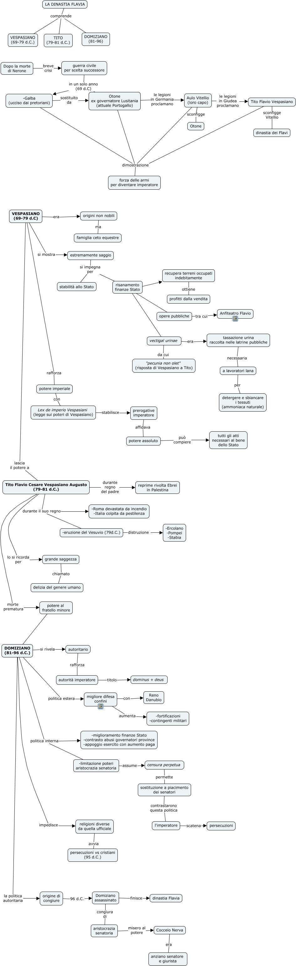 Questa Cmap, creata con IHMC CmapTools, contiene informazioni relative a: 1) Dinastia Flavia, l'imperatore scatena persecuzioni, Tito Flavio Cesare Vespasiano Augusto (79-81 d.C.) morte prematura potere al fratello minore, origine di congiure 96 d.C. Domiziano assassinato, Tito Flavio Vespasiano sconfigge Vitellio dinastia dei Flavi, tassazione urina raccolta nelle latrine pubbliche necessaria a lavoratori lana, censura perpetua permette sostituzione a piacimento dei senatori, recupera terreni occupati indebitamente ottiene profitti dalla vendita, Tito Flavio Vespasiano dimostrazione forza delle armi per diventare imperatore, Cocceio Nerva era anziano senatore e giurista, migliore difesa confini aumenta -fortificazioni -contingenti militari, -Galba (ucciso dai pretoriani) dimostrazione forza delle armi per diventare imperatore, sostituzione a piacimento dei senatori contrastarono questa politica l'imperatore, Aulo Vitellio (loro capo) sconfigge Otone, a lavoratori lana per detergere e sbiancare i tessuti (ammoniaca naturale), DOMIZIANO (81-96 d.C.) si rivela autoritario, Otone ex governatore Lusitania (attuale Portogallo) le legioni in Germania proclamano Aulo Vitellio (loro capo), VESPASIANO (69-79 d.C) era origini non nobili, risanamento finanze Stato ???? recupera terreni occupati indebitamente, potere imperiale con Lex de imperio Vespasiani (legge sui poteri di Vespasiano), potere assoluto può compiere tutti gli atti necessari al bene dello Stato