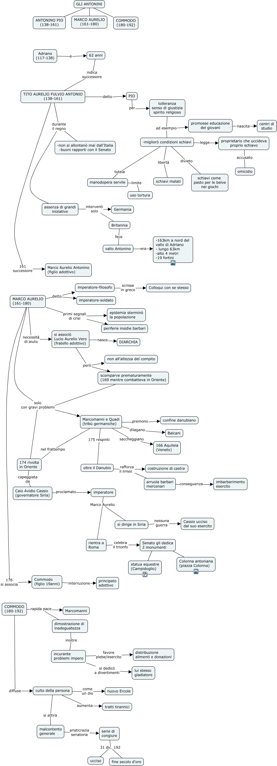 Questa Cmap, creata con IHMC CmapTools, contiene informazioni relative a: Antonini, Britannia fece vallo Antonino, 62 anni indica successore TITO AURELIO FULVIO ANTONIO (138-161), MARCO AURELIO (161-180) 176 si associa Commodo (figlio 19anni), serie di congiure 31 dic. 192 ucciso, imperatore Marco Aurelio si dirige in Siria, MARCO AURELIO (161-180) detto imperatore-filosofo, incurante problemi impero si dedicò a divertimenti lui stesso gladiatore, Marcomanni e Quadi (tribù germaniche) saccheggiano 166 Aquileia (Veneto), incurante problemi impero favore plebe/esercito distribuzione alimenti e donazioni, si dirige in Siria nessuna guerra Cassio ucciso dal suo esercito, si associò Lucio Aurelio Vero (fratello adottivo) però scomparve prematuramente (169 mentre combatteva in Oriente), TITO AURELIO FULVIO ANTONIO (138-161) durante il regno -non si allontanò mai dall'Italia -buoni rapporti con il Senato, malcontento generale aristicrazia senatoria serie di congiure, tolleranza senso di giustizia spirito religioso ad esempio -migliorò condizioni schiavi, Marcomanni e Quadi (tribù germaniche) 175 respinti oltre il Danubio, -migliorò condizioni schiavi legge proprietario che uccideva proprio schiavo, oltre il Danubio rafforza il limes costruzione di castra, manodopera servile limite uso tortura, scomparve prematuramente (169 mentre combatteva in Oriente) solo con gravi problemi 174 rivolta in Oriente, GLI ANTONINI ???? COMMODO (180-192)