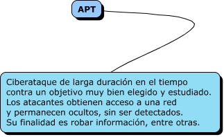 Este Cmap, tiene información relacionada con: APT, APT Ciberataque de larga duración en el tiempo contra un objetivo muy bien elegido y estudiado. Los atacantes obtienen acceso a una red y permanecen ocultos, sin ser detectados. Su finalidad es robar información, entre otras.