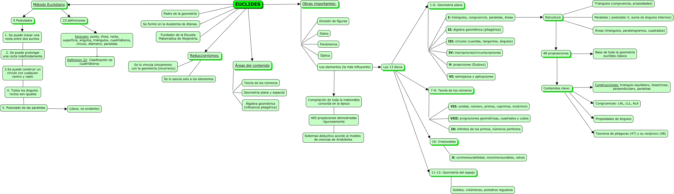 Este Cmap, tiene información relacionada con: Euclides, 48 proposiciones ???? Contenidos clave:, Obras importantes: Datos, EUCLIDES ???? Padre de la geometría, Estructura ???? Triangulos (congruencia, propiedades), Obras importantes: División de figuras, 7-9: Teoría de los números IX: infinitos de los primos, números perfectos, 1-6: Geometria plana I: triangulos, congruencia, paralelas, áreas, EUCLIDES ???? Áreas del contenido, Los 13 libros ???? 1-6: Geometria plana, Reduccionismos: ???? Se lo vincula únicamente con la geometría (incorrecto), Método Euclidiano ???? 5 Postulados, Los 13 libros ???? 11-13: Geometría del espejo, Estructura ???? 48 proposiciones, Estructura ???? Paralelas ( postulado V, suma de ángulos internos), Reduccionismos: ???? Se lo asocia solo a los elementos, I: triangulos, congruencia, paralelas, áreas ???? Estructura, 48 proposiciones ???? Base de toda la geometría euclídea clasica, 1-6: Geometria plana II: álgebra geométrica (pitagórica), 1-6: Geometria plana IV: inscripciones/circunscripciones, Obras importantes: Óptica