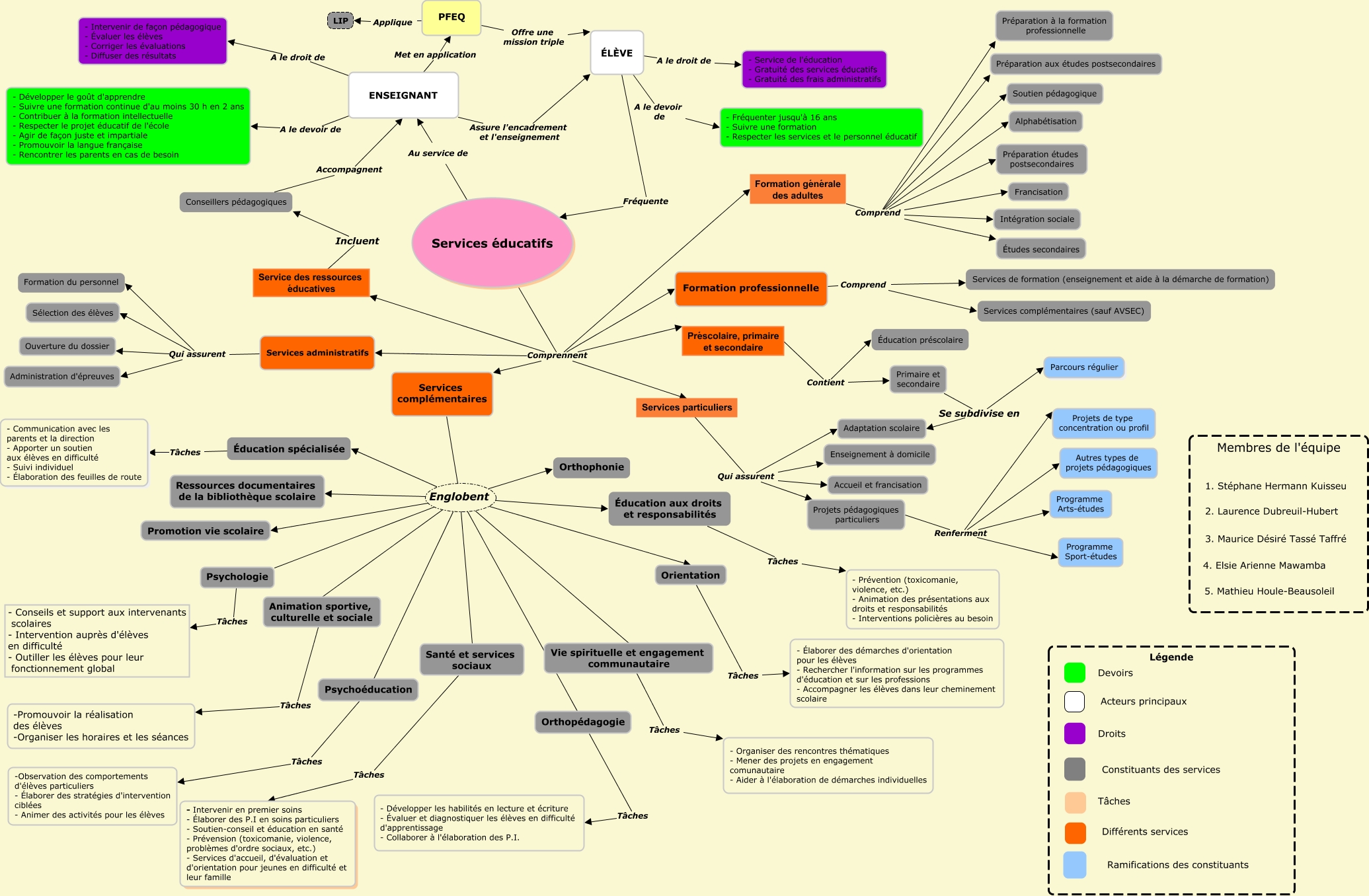 Cette carte de concepts créée avec IHMC CmapTools traite de: Cmap_INT711_VOLET 4 _EQUIPE 9, Service des ressources éducatives Incluent Conseillers pédagogiques, Psychologie Tâches - Conseils et support aux intervenants scolaires - Intervention auprès d'élèves en difficulté - Outiller les élèves pour leur fonctionnement global, ENSEIGNANT Met en application PFEQ, Services éducatifs Comprennent Service des ressources éducatives, Préscolaire, primaire et secondaire Contient Éducation préscolaire, Formation générale des adultes Comprend Préparation à la formation professionnelle, Éducation spécialisée Tâches - Communication avec les parents et la direction - Apporter un soutien aux élèves en difficulté - Suivi individuel - Élaboration des feuilles de route, Projets pédagogiques particuliers Renferment Programme Arts-études, Services complémentaires Englobent Santé et services sociaux, Primaire et secondaire Se subdivise en Adaptation scolaire, Services administratifs Qui assurent Administration d'épreuves, Formation générale des adultes Comprend Études secondaires, Formation générale des adultes Comprend Intégration sociale, Animation sportive, culturelle et sociale Tâches -Promouvoir la réalisation des élèves -Organiser les horaires et les séances, Conseillers pédagogiques Accompagnent ENSEIGNANT, Services complémentaires Englobent Psychoéducation, Vie spirituelle et engagement communautaire Tâches - Organiser des rencontres thématiques - Mener des projets en engagement comunautaire - Aider à l'élaboration de démarches individuelles, Services complémentaires Englobent Éducation spécialisée, PFEQ Applique LIP, ENSEIGNANT A le droit de - Intervenir de façon pédagogique - Évaluer les élèves - Corriger les évaluations - Diffuser des résultats
