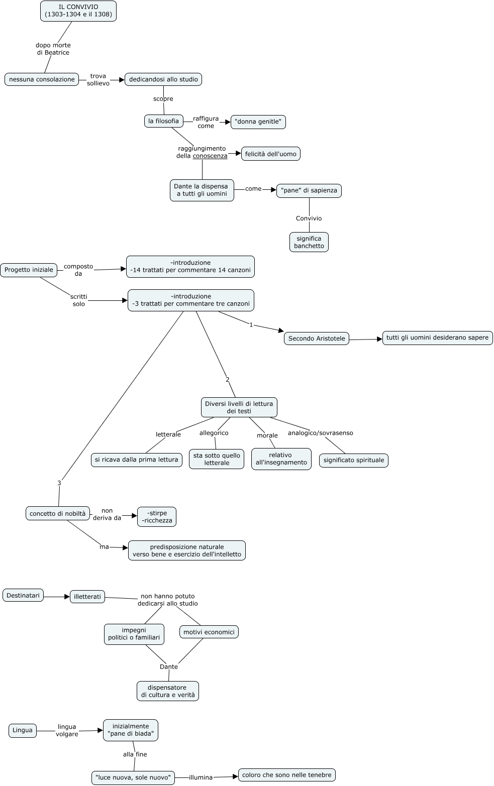 Questa Cmap, creata con IHMC CmapTools, contiene informazioni relative a: 3_Convivio, inizialmente "pane di biada" alla fine "luce nuova, sole nuovo", la filosofia raggiungimento della conoscenza felicità dell'uomo, Diversi livelli di lettura dei testi letterale si ricava dalla prima lettura, Lingua lingua volgare inizialmente "pane di biada", Diversi livelli di lettura dei testi allegorico sta sotto quello letterale, nessuna consolazione trova sollievo dedicandosi allo studio, "pane" di sapienza Convivio significa banchetto, IL CONVIVIO (1303-1304 e il 1308) dopo morte di Beatrice nessuna consolazione, Destinatari ???? illetterati, illetterati non hanno potuto dedicarsi allo studio motivi economici, concetto di nobiltà non deriva da -stirpe -ricchezza, Diversi livelli di lettura dei testi analogico/sovrasenso significato spirituale, motivi economici Dante dispensatore di cultura e verità, Diversi livelli di lettura dei testi morale relativo all'insegnamento, la filosofia raffigura come "donna genitle", la filosofia raggiungimento della conoscenza Dante la dispensa a tutti gli uomini, illetterati non hanno potuto dedicarsi allo studio impegni politici o familiari, Progetto iniziale scritti solo -introduzione -3 trattati per commentare tre canzoni, Dante la dispensa a tutti gli uomini come "pane" di sapienza, -introduzione -3 trattati per commentare tre canzoni 1 Secondo Aristotele