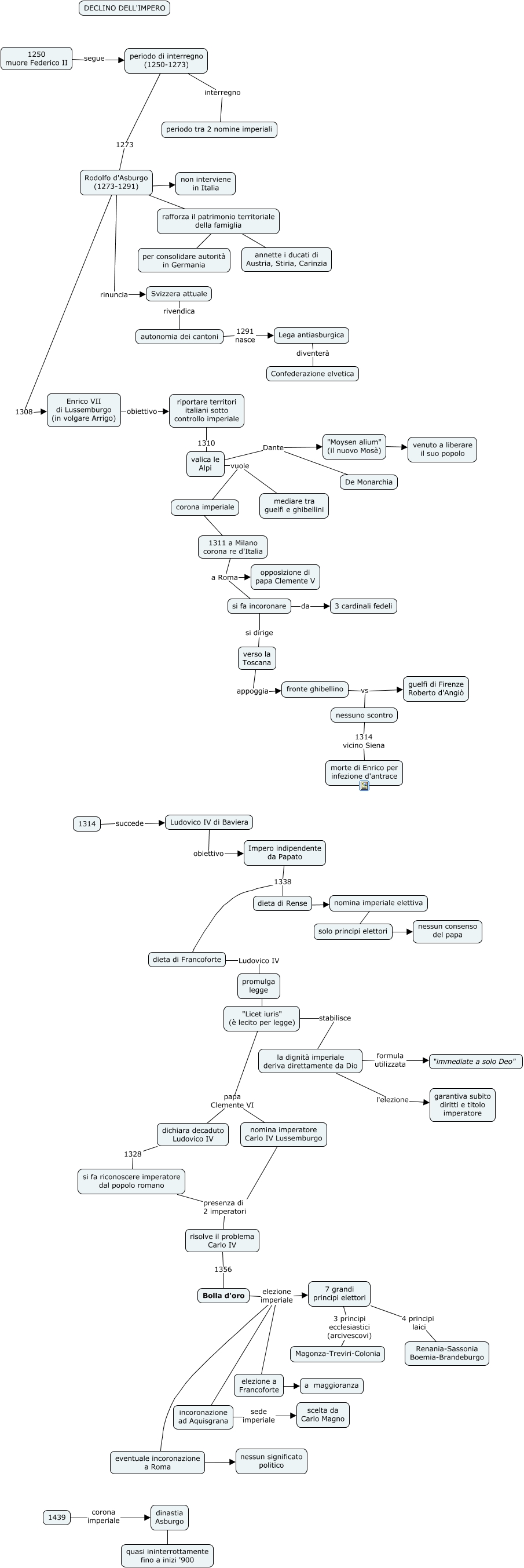 Questa Cmap, creata con IHMC CmapTools, contiene informazioni relative a: Il declino dell'impero, autonomia dei cantoni 1291 nasce Lega antiasburgica, incoronazione ad Aquisgrana sede imperiale scelta da Carlo Magno, Bolla d'oro elezione imperiale eventuale incoronazione a Roma, "Moysen alium" (il nuovo Mosè) ???? venuto a liberare il suo popolo, 7 grandi principi elettori 4 principi laici Renania-Sassonia Boemia-Brandeburgo, "Licet iuris" (è lecito per legge) papa Clemente VI nomina imperatore Carlo IV Lussemburgo, rafforza il patrimonio territoriale della famiglia ???? annette i ducati di Austria, Stiria, Carinzia, Enrico VII di Lussemburgo (in volgare Arrigo) obiettivo riportare territori italiani sotto controllo imperiale, Impero indipendente da Papato 1338 dieta di Francoforte, Ludovico IV di Baviera obiettivo Impero indipendente da Papato, promulga legge ???? "Licet iuris" (è lecito per legge), si fa incoronare da 3 cardinali fedeli, dichiara decaduto Ludovico IV 1328 si fa riconoscere imperatore dal popolo romano, rafforza il patrimonio territoriale della famiglia ???? per consolidare autorità in Germania, Rodolfo d'Asburgo (1273-1291) 1308 Enrico VII di Lussemburgo (in volgare Arrigo), eventuale incoronazione a Roma ???? nessun significato politico, "Licet iuris" (è lecito per legge) stabilisce la dignità imperiale deriva direttamente da Dio, fronte ghibellino vs guelfi di Firenze Roberto d'Angiò, Rodolfo d'Asburgo (1273-1291) rinuncia Svizzera attuale, Lega antiasburgica diventerà Confederazione elvetica
