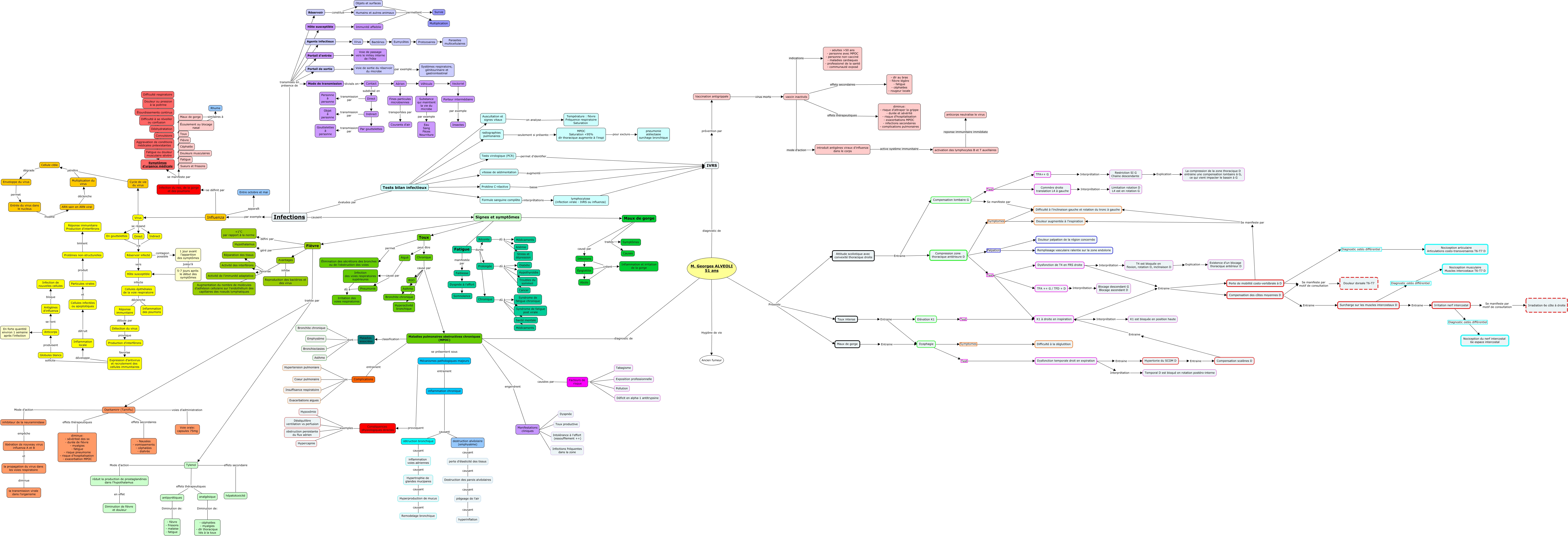 This Concept Map, created with IHMC CmapTools, has information related to: Cas 3 Infection - Francis, la propagation du virus dans les voies respiratoire diminue la transmission virale dans l'organisme, Mode de transmission divisés en Aérien, Avantages favorise Augmentation du nombre de molécules d'adhésion cellulaire sur l'endothélium des capillaires des noeuds lymphatiques, Commère droite translation L4 à gauche Interprétation Limitation rotation D L4 est en rotation G, M. Georges ALVEOLI 51 ans Présente Maux de gorge, Infection du nez, de la gorge et des poumons se manifeste par Fièvre, Manifestations cliniques Infections fréquentes dans la zone, Multiplication du virus pénètre Cellule cible, Compression zone thoracique antérieure D Palpation Douleur palpation de la région concernée, Aiguë causé par Infection des voies respiratoires supérieures, TFA++ G Interprétation Restriction SI G Chaine descendante, lymphocytose (infection virale - IVRS ou influenza) IVRS, Chronique causé par Bronchite chronique, Pneumonie dû à Irritation des voies respiratoires, Maladies associées dont Asthme, Mode de transmission divisés en Vectoriel, Récente dû à Médicaments, inflammation chronique causant destruction alvéolaire (emphysème), Prolongée dû à Hypothyroïdie, Cellule cible dégrade Enveloppe du virus