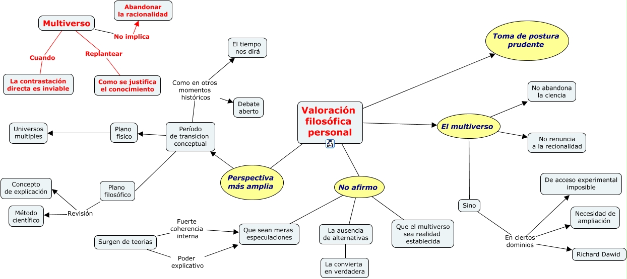 Este Cmap, tiene información relacionada con: Valoracion filosofica personal, Período de transicion conceptual Plano fisico, Multiverso No implica Abandonar la racionalidad, No afirmo Que sean meras especulaciones, Sino En ciertos dominios Necesidad de ampliación, Multiverso Cuando La contrastación directa es inviable, Período de transicion conceptual Como en otros momentos históricos Debate aberto, Período de transicion conceptual Plano filosófico, Sino En ciertos dominios Richard Dawid, No afirmo Que el multiverso sea realidad establecida, No afirmo La ausencia de alternativas, Plano filosófico Revisión Método científico, Plano fisico Universos multiples, Valoración filosófica personal El multiverso, Valoración filosófica personal Perspectiva más amplia, La ausencia de alternativas La convierta en verdadera, Surgen de teorias Fuerte coherencia interna Que sean meras especulaciones, Perspectiva más amplia Período de transicion conceptual, Multiverso Replantear Como se justifica el conocimiento, El multiverso Sino, El multiverso No abandona la ciencia
