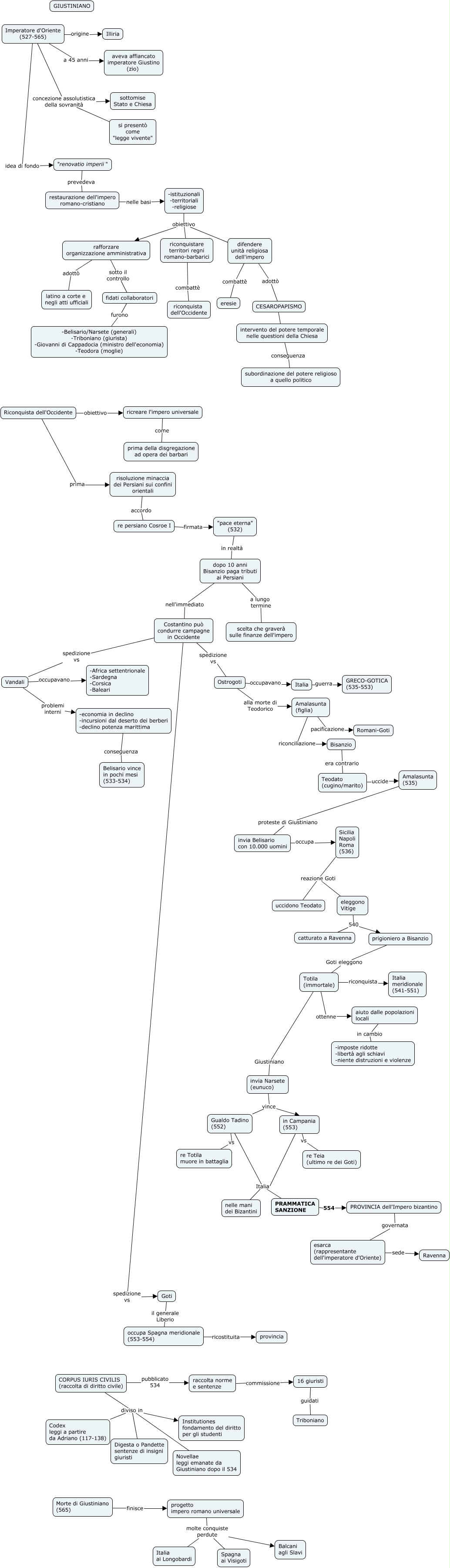 Questa Cmap, creata con IHMC CmapTools, contiene informazioni relative a: Giustiniano, CORPUS IURIS CIVILIS (raccolta di diritto civile) diviso in Codex leggi a partire da Adriano (117-138), Amalasunta (535) proteste di Giustiniano invia Belisario con 10.000 uomini, "pace eterna" (532) in realtà dopo 10 anni Bisanzio paga tributi ai Persiani, fidati collaboratori furono -Belisario/Narsete (generali) -Triboniano (giurista) -Giovanni di Cappadocia (ministro dell'economia) -Teodora (moglie), Imperatore d'Oriente (527-565) idea di fondo "renovatio imperii", Italia guerra GRECO-GOTICA (535-553), Imperatore d'Oriente (527-565) origine Illiria, "renovatio imperii" prevedeva restaurazione dell'impero romano-cristiano, dopo 10 anni Bisanzio paga tributi ai Persiani a lungo termine scelta che graverà sulle finanze dell'impero, re persiano Cosroe I firmata "pace eterna" (532), Totila (immortale) ottenne aiuto dalle popolazioni locali, CORPUS IURIS CIVILIS (raccolta di diritto civile) diviso in Digesta o Pandette sentenze di insigni giuristi, Costantino può condurre campagne in Occidente spedizione vs Goti, in Campania (553) Italia nelle mani dei Bizantini, eleggono Vitige 540 catturato a Ravenna, Ostrogoti alla morte di Teodorico Amalasunta (figlia), Vandali problemi interni -economia in declino -incursioni dal deserto dei berberi -declino potenza marittima, PROVINCIA dell'Impero bizantino governata esarca (rappresentante dell'imperatore d'Oriente), aiuto dalle popolazioni locali in cambio -imposte ridotte -libertà agli schiavi -niente distruzioni e violenze, risoluzione minaccia dei Persiani sui confini orientali accordo re persiano Cosroe I