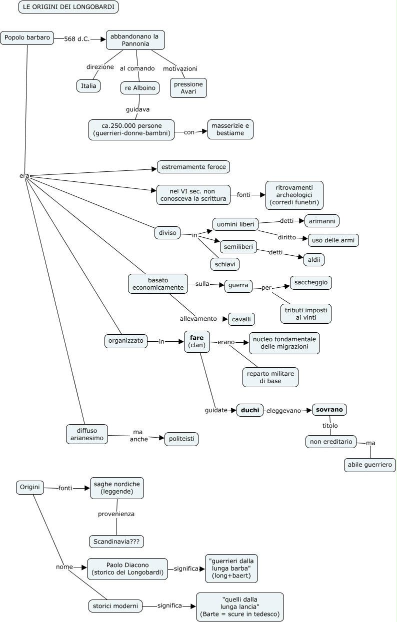 Questa Cmap, creata con IHMC CmapTools, contiene informazioni relative a: Origini, basato economicamente allevamento cavalli, diviso in semiliberi, storici moderni significa "quelli dalla lunga lancia" (Barte = scure in tedesco), re Alboino guidava ca.250.000 persone (guerrieri-donne-bambni), Origini fonti saghe nordiche (leggende), Popolo barbaro era organizzato, sovrano titolo non ereditario, guerra per tributi imposti ai vinti, Popolo barbaro era diviso, Popolo barbaro era nel VI sec. non conosceva la scrittura, Popolo barbaro 568 d.C. abbandonano la Pannonia, Popolo barbaro era estremamente feroce, non ereditario ma abile guerriero, abbandonano la Pannonia direzione Italia, fare (clan) guidate duchi, Origini nome Paolo Diacono (storico dei Longobardi), basato economicamente sulla guerra, nel VI sec. non conosceva la scrittura fonti ritrovamenti archeologici (corredi funebri), duchi eleggevano sovrano, Popolo barbaro era diffuso arianesimo