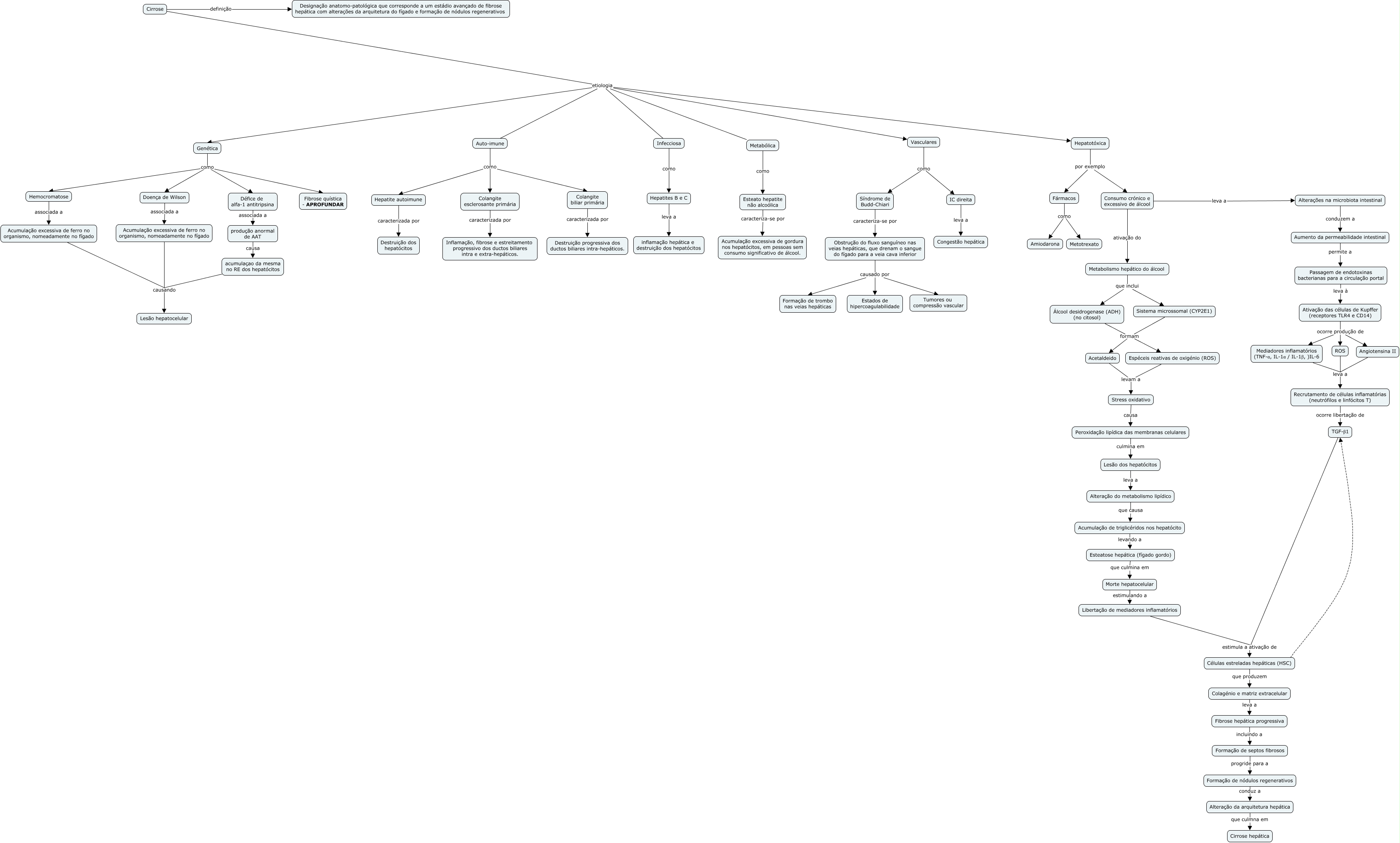 Esse mapa conceitual, produzido no IHMC CmapTools, tem a informação relacionada a: Cirrose Tita, Acetaldeido levam a Stress oxidativo, TGF-β1 estimula a ativação de Células estreladas hepáticas (HSC), Álcool desidrogenase (ADH) (no citosol) formam Espéceis reativas de oxigénio (ROS), Ativação das células de Kupffer (receptores TLR4 e CD14) ocorre produção de Mediadores inflamatórios (TNF-α, IL-1α / IL-1β, )IL-6, Passagem de endotoxinas bacterianas para a circulação portal leva à Ativação das células de Kupffer (receptores TLR4 e CD14), Hepatite autoimune caracterizada por Destruição dos hepatócitos, Genética como Doença de Wilson, Genética como Défice de alfa-1 antitripsina, Défice de alfa-1 antitripsina associada a produção anormal de AAT, Formação de septos fibrosos progride para a Formação de nódulos regenerativos, Colagénio e matriz extracelular leva a Fibrose hepática progressiva, Genética como Hemocromatose, Colangite esclerosante primária caracterizada por Inflamação, fibrose e estreitamento progressivo dos ductos biliares intra e extra-hepáticos., Esteato hepatite não alcoólica caracteriza-se por Acumulação excessiva de gordura nos hepatócitos, em pessoas sem consumo significativo de álcool., Esteatose hepática (fígado gordo) que culmina em Morte hepatocelular, Doença de Wilson associada a Acumulação excessiva de ferro no organismo, nomeadamente no fígado, Hepatotóxica por exemplo Fármacos, Células estreladas hepáticas (HSC) que produzem Colagénio e matriz extracelular, Cirrose etiologia Genética, Alteração da arquitetura hepática que culmna em Cirrose hepática