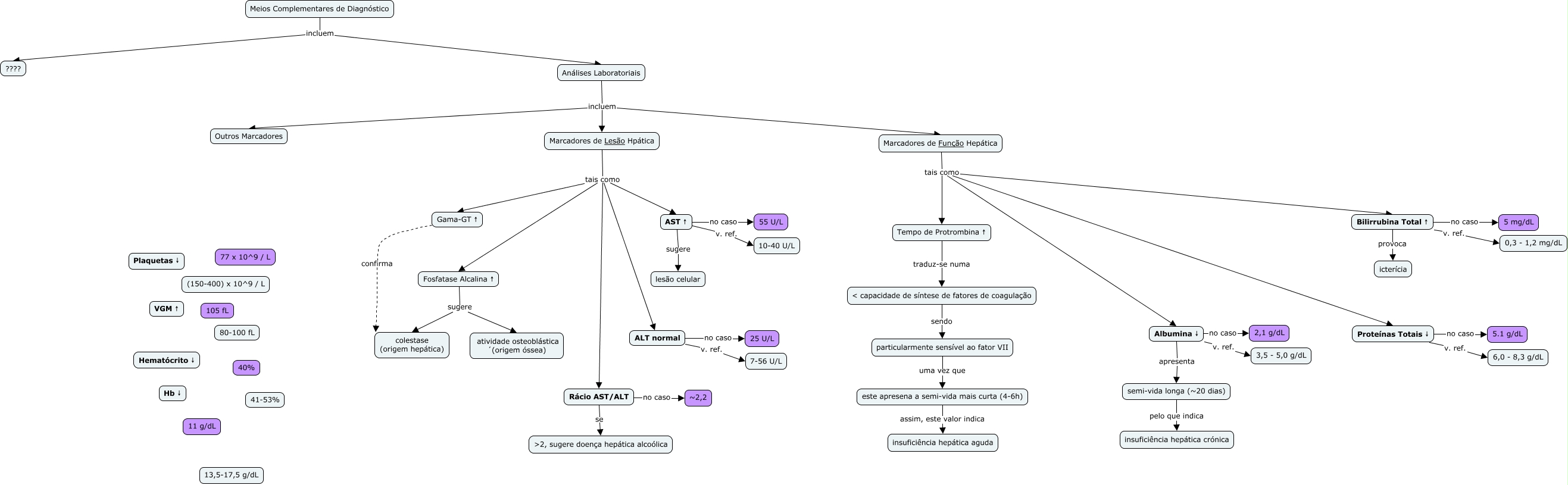 Esse mapa conceitual, produzido no IHMC CmapTools, tem a informação relacionada a: Cirrose Bea, AST ↑ v. ref. 10-40 U/L, Proteínas Totais ↓ v. ref. 6,0 - 8,3 g/dL, Albumina ↓ no caso 2,1 g/dL, ALT normal v. ref. 7-56 U/L, ALT normal no caso 25 U/L, Meios Complementares de Diagnóstico incluem ????, Marcadores de Lesão Hpática tais como AST ↑, Bilirrubina Total ↑ no caso 5 mg/dL, AST ↑ sugere lesão celular, Proteínas Totais ↓ no caso 5.1 g/dL, este apresena a semi-vida mais curta (4-6h) assim, este valor indica insuficiência hepática aguda, Análises Laboratoriais incluem Marcadores de Lesão Hpática, Albumina ↓ apresenta semi-vida longa (~20 dias), Albumina ↓ v. ref. 3,5 - 5,0 g/dL, Marcadores de Lesão Hpática tais como ALT normal, Análises Laboratoriais incluem Marcadores de Função Hepática, Meios Complementares de Diagnóstico incluem Análises Laboratoriais, Gama-GT ↑ confirma colestase (origem hepática), Marcadores de Função Hepática tais como Bilirrubina Total ↑, Bilirrubina Total ↑ provoca icterícia