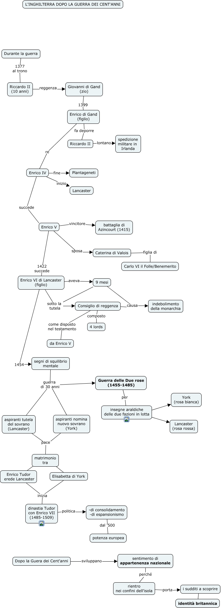 Questa Cmap, creata con IHMC CmapTools, contiene informazioni relative a: Inghilterra dopo Guerra dei Cent'anni, Riccardo II lontano spedizione militare in Irlanda, Enrico Tudor erede Lancaster inizia dinastia Tudor con Enrico VII (1485-1509), Enrico VI di Lancaster (figlio) aveva 9 mesi, Guerra delle Due rose (1455-1485) per insegne araldiche delle due fazioni in lotta, Durante la guerra 1377 al trono Riccardo II (10 anni), insegne araldiche delle due fazioni in lotta ???? York (rosa bianca), segni di squilibrio mentale guerra di 30 anni Guerra delle Due rose (1455-1485), segni di squilibrio mentale guerra di 30 anni aspiranti tutela del sovrano (Lancaster), segni di squilibrio mentale guerra di 30 anni aspiranti nomina nuovo sovrano (York), aspiranti nomina nuovo sovrano (York) pace matrimonio tra, Elisabetta di York inizia dinastia Tudor con Enrico VII (1485-1509), Dopo la Guera dei Cent'anni sviluppano sentimento di appartenenza nazionale, Consiglio di reggenza composto 4 lords, Enrico VI di Lancaster (figlio) sotto la tutela Consiglio di reggenza, Enrico V vincitore battaglia di Azincourt (1415), insegne araldiche delle due fazioni in lotta ???? Lancaster (rosa rossa), Enrico IV succede Enrico V, i sudditi a scoprire ???? identità britannica, Giovanni di Gand (zio) 1399 Enrico di Gand (figlio), Consiglio di reggenza come disposto nel testamento da Enrico V