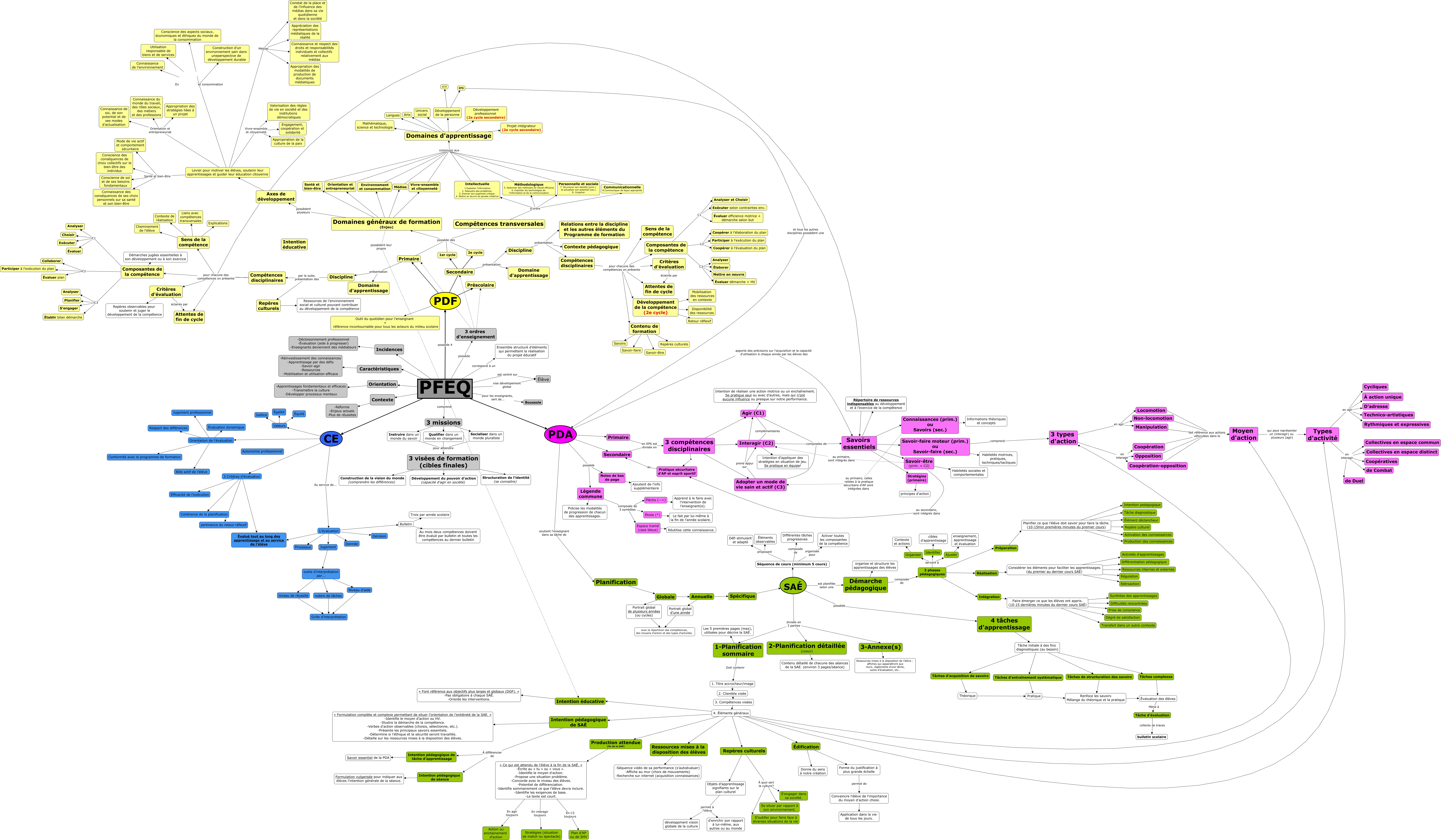 Cette carte de concepts créée avec IHMC CmapTools traite de: Compétences disciplinaires (1316 PM - 20 avril 2026), Secondaire 1er cycle, Domaines généraux de formation (Enjeu) Environnement et consommation, Domaines d'apprentissage Univers social, 3 compétences disciplinaires Interagir (C2), Interagir (C2) composées de Savoirs essentiels, 3 phases pédagogiques Intégration, Domaines généraux de formation (Enjeu) Vivre-ensemble et citoyenneté, Savoirs essentiels Savoir-faire moteur (prim.) ou Savoir-faire (sec.), 3 compétences disciplinaires Adopter un mode de vie sain et actif (C3), Bulletin Au mois deux compétences doivent être évalué par bulletin et toutes les compétences au dernier bulletin, Orientation de l'évaluation Conformité avec le programme de formation, PFEQ correspond à un Ensemble structuré d’éléments qui permettent la réalisation du projet éducatif, L'évaluation Processus, Annuelle Spécifique, Composantes de la compétence C3 Planifier, outils d'interprétation par... noblre de tâches, Édification Donne du sens à notre création, Composantes de la compétence C3 Évaluer démarche + HV, Types d'activité en interagir de Duel, 3-Annexe(s) Ressources mises à la disposition de l’élève : affiches qui apparaîtront aux murs, règlements d’une tâche, outils d’évaluation, etc…