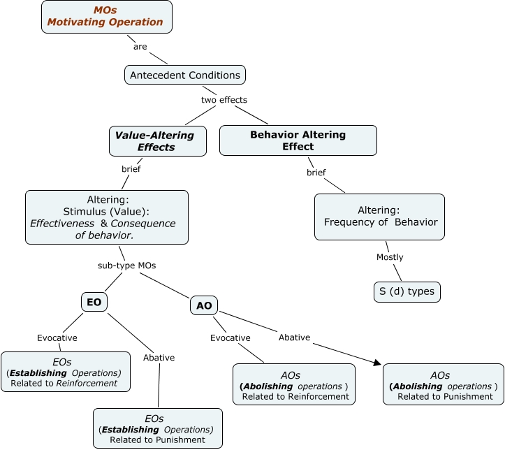 This Concept Map, created with IHMC CmapTools, has information related to: Motivating Operation, MOs Motivating Operation are Antecedent Conditions, Altering: Stimulus (Value): Effectiveness & Consequence of behavior. sub-type MOs EO, AO Abative AOs (Abolishing operations) Related to Punishment, Value-Altering Effects brief Altering: Stimulus (Value): Effectiveness & Consequence of behavior., Antecedent Conditions two effects Behavior Altering Effect, EO Abative EOs (Establishing Operations) Related to Punishment, Antecedent Conditions two effects Value-Altering Effects, AO Evocative AOs (Abolishing operations) Related to Reinforcement, Altering: Frequency of Behavior Mostly S (d) types, Altering: Stimulus (Value): Effectiveness & Consequence of behavior. sub-type MOs AO, Behavior Altering Effect brief Altering: Frequency of Behavior, EO Evocative EOs (Establishing Operations) Related to Reinforcement