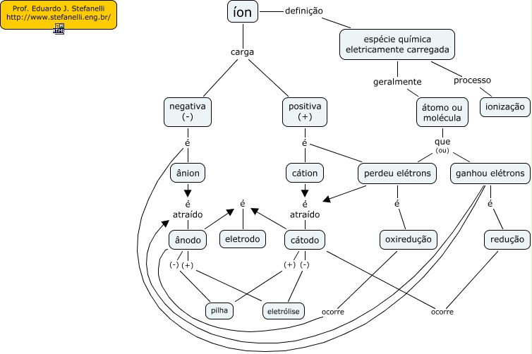 Esse mapa conceitual, produzido no IHMC CmapTools, tem a informação relacionada a: ion, íon carga positiva (+), átomo ou molécula que (ou) ganhou elétrons, íon carga negativa (-), perdeu elétrons é positiva (+), cátodo (+) pilha, ganhou elétrons é atraído ânodo, espécie química eletricamente carregada geralmente átomo ou molécula, ganhou elétrons é ânion, redução ocorre cátodo, cátodo (-) eletrólise, oxiredução ocorre ânodo, perdeu elétrons é oxiredução, espécie química eletricamente carregada processo ionização, átomo ou molécula que (ou) perdeu elétrons, cátion é atraído cátodo, ânodo (+) eletrólise, ânodo (-) pilha, perdeu elétrons é atraído cátodo, cátion é positiva (+), ânion é atraído ânodo