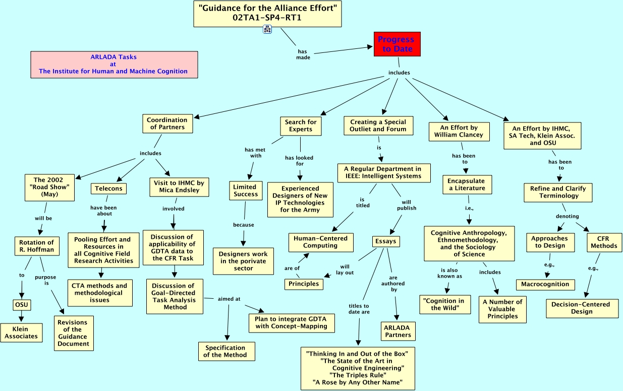 Guidance Task Progress, Essays are authored by ARLADA Partners, "Guidance for the Alliance Effort" 02TA1-SP4-RT1 has made Progress to Date, Visit to IHMC by Mica Endsley involved Discussion of Goal-Directed Task Analysis Method, Search for Experts has looked for Experienced Designers of New IP Technologies for the Army, Cognitive Anthropology, Ethnomethodology, and the Sociology of Science is also known as "Cognition in the Wild", Cognitive Anthropology, Ethnomethodology, and the Sociology of Science includes A Number of Valuable Principles, Essays titles to date are "Thinking In and Out of the Box" "The State of the Art in Cognitive Engineering" "The Triples Rule" "A Rose by Any Other Name", Search for Experts has met with Limited Success, Telecons have been about Pooling Effort and Resources in all Cognitive Field Research Activities, The 2002 "Road Show" (May) will be Rotation of R. Hoffman