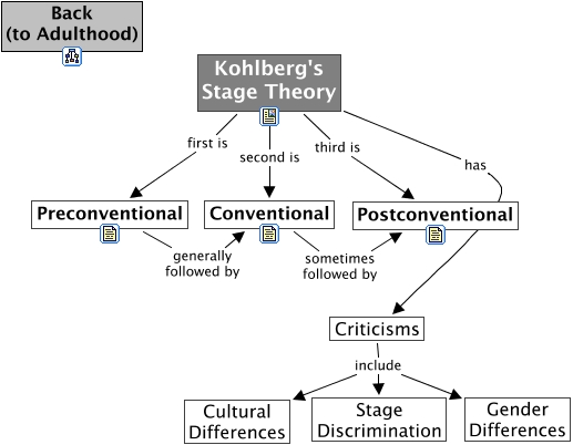 This Concept Map, created with IHMC CmapTools, has information related to: Kohlberg's Theory in Adulthood, Kohlberg's Stage Theory has Criticisms, Criticisms include Stage Discrimination, Criticisms include Cultural Differences, Criticisms include Gender Differences, Preconventional generally followed by Conventional, Kohlberg's Stage Theory first is Preconventional, Conventional sometimes followed by Postconventional, Kohlberg's Stage Theory second is Conventional, Kohlberg's Stage Theory third is Postconventional