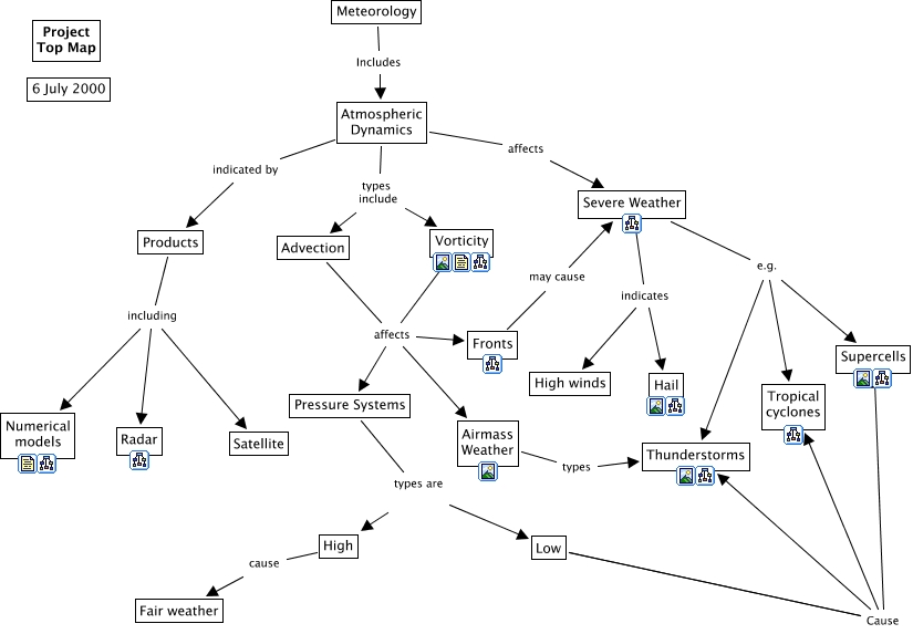 This Concept Map, created with IHMC CmapTools, has information related to: Top Atmospheric Dynamics, Severe Weather e.g. Supercells, Low Cause Supercells, Pressure Systems types are Low, Low Cause Supercells, Products including Radar, Low Cause Thunderstorms, Severe Weather indicates Hail, Severe Weather e.g. Tropical cyclones, Vorticity affects Fronts, Atmospheric Dynamics affects Severe Weather, Vorticity affects Airmass Weather, Products including Numerical models, Severe Weather indicates High winds, Low Cause Thunderstorms, Advection affects Airmass Weather, Advection affects Pressure Systems, Low Cause Tropical cyclones, Vorticity affects Pressure Systems, Fronts may cause Severe Weather, Low Cause Tropical cyclones