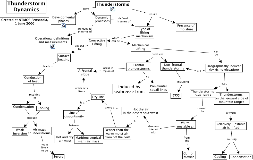 This Concept Map, created with IHMC CmapTools, has information related to: Thunderstorm Dynamics, Thunderstorms have Developmental phases, Thunderstorms have Dynamic processes, Thunderstorms require Presence of moisture, Cooling produce Weak inversion, Hot dry air in the desert southwest along a Dry line, Dynamic processes defined in terms of Type of lifting mechanism, Line of discontinuity between Maritime tropical warn air mass, Thunderstorms require Type of lifting mechanism, Frontal thunderstorms eg induced by seabreeze front, Dry line is a Line of discontinuity, Warm unstable air from the Gulf of Mexico, Cooling produce Air mass thunderstorms, Dynamic processes are gauged in terms of Operational definitions and measurements, Conduction of heat resulting in Cooling, Mechanical Lifting produces Non-frontal thunderstorms, Air mass thunderstorms not as likely to be Severe, Mechanical Lifting can be Orographically induced (by rising elevation), Non-frontal thunderstorms including ????, Frontal thunderstorms occur in region of A Frontal slope, Conduction of heat resulting in Condensation