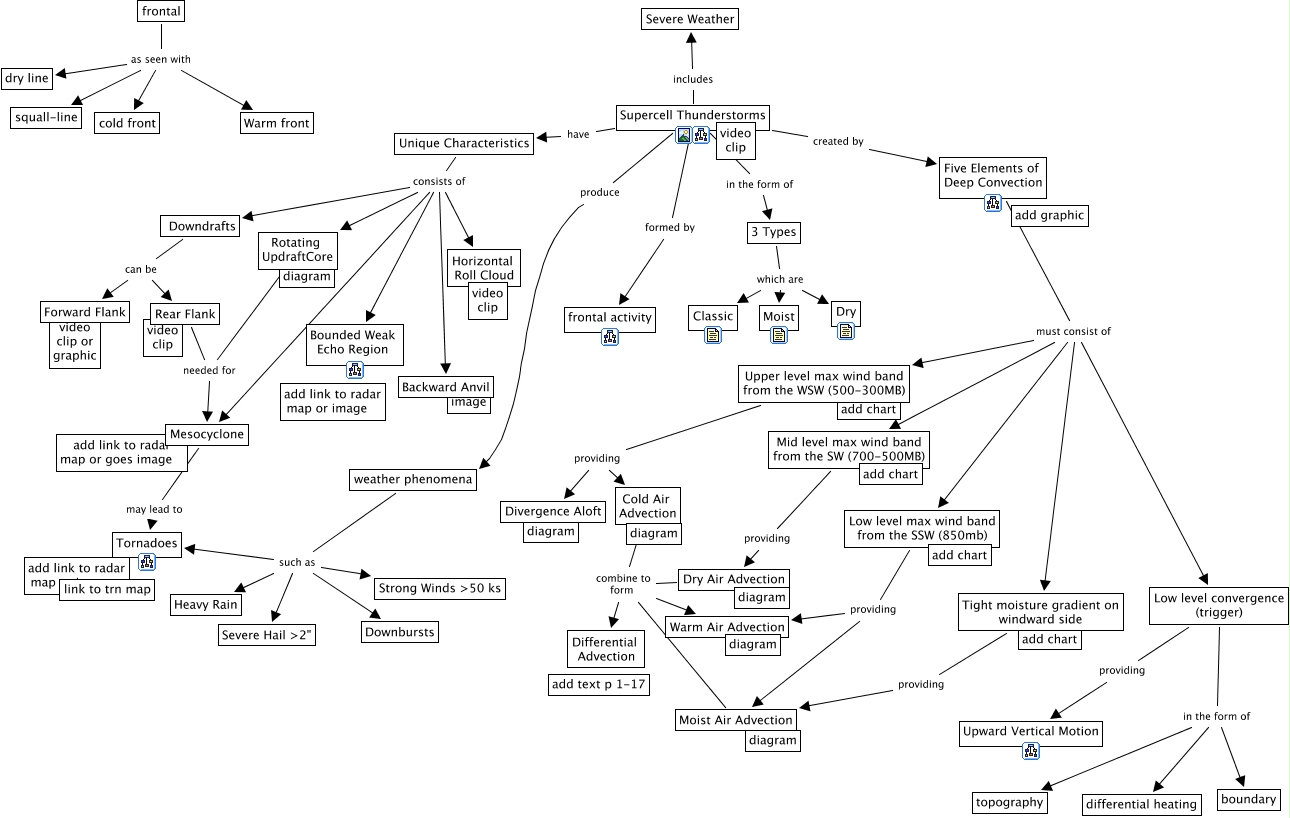 This Concept Map, created with IHMC CmapTools, has information related to: Supercell Thunderstorms 03 May 00, Dry Air Advection combine to form Warm Air Advection, Low level convergence (trigger) in the form of boundary, Unique Characteristics consists of Downdrafts, Low level max wind band from the SSW (850mb) providing Moist Air Advection, Supercell Thunderstorms includes Severe Weather, Mid level max wind band from the SW (700-500MB) providing Dry Air Advection, Low level max wind band from the SSW (850mb) providing Warm Air Advection, Downdrafts can be Forward Flank, Upper level max wind band from the WSW (500-300MB) providing Cold Air Advection, Upper level max wind band from the WSW (500-300MB) providing Divergence Aloft, weather phenomena such as Tornadoes, Low level convergence (trigger) providing Upward Vertical Motion, Unique Characteristics consists of Horizontal Roll Cloud, Five Elements of Deep Convection must consist of Tight moisture gradient on windward side, Unique Characteristics consists of Backward Anvil, Cold Air Advection combine to form Differential Advection, frontal as seen with dry line, Five Elements of Deep Convection must consist of Low level convergence (trigger), Supercell Thunderstorms produce weather phenomena, Moist Air Advection combine to form Warm Air Advection