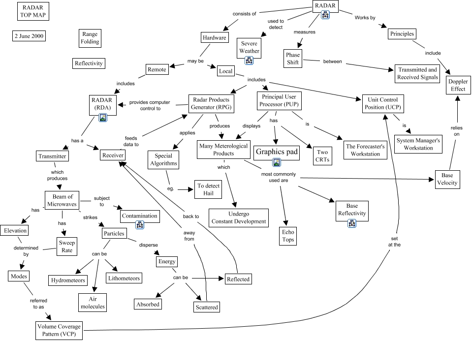 Este Cmap, tiene información relacionada con: RADAR, Energy can be Scattered, Hardware may be Local, Many Meterological Products which Undergo Constant Development, RADAR used to detect Severe Weather, Principles include Doppler Effect, Radar Products Generator (RPG) applies Special Algorithms, Phase Shift between Transmitted and Received Signals, Sweep Rate determined by Modes, Beam of Microwaves strikes Particles, RADAR (RDA) has a Transmitter, Many Meterological Products most commonly used are Echo Tops, Particles can be Hydrometeors, Modes referred to as Volume Coverage Pattern (VCP), Energy can be Absorbed, RADAR (RDA) has a Receiver, Special Algorithms eg. To detect Hail, Hardware may be Remote, Radar Products Generator (RPG) produces Many Meterological Products, Particles can be Lithometeors, Many Meterological Products most commonly used are Base Reflectivity