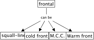 This Concept Map, created with IHMC CmapTools, has information related to: frontal, frontal can be M.C.C., frontal can be squall-line, frontal can be Warm front, frontal can be cold front