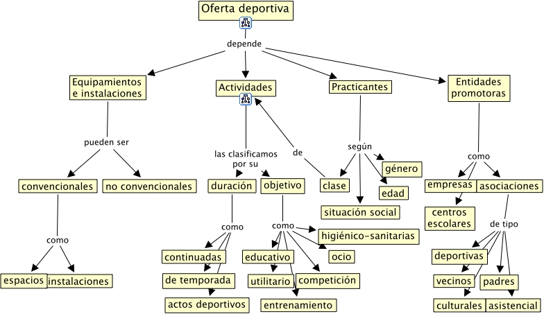 Oferta deportiva. Elementos, Oferta deportiva depende Equipamientos e instalaciones, Practicantes según clase, Oferta deportiva depende Entidades promotoras, asociaciones de tipo vecinos, Entidades promotoras como empresas, Practicantes según edad, duración como de temporada, Equipamientos e instalaciones pueden ser no convencionales, asociaciones de tipo asistencial, objetivo como competición